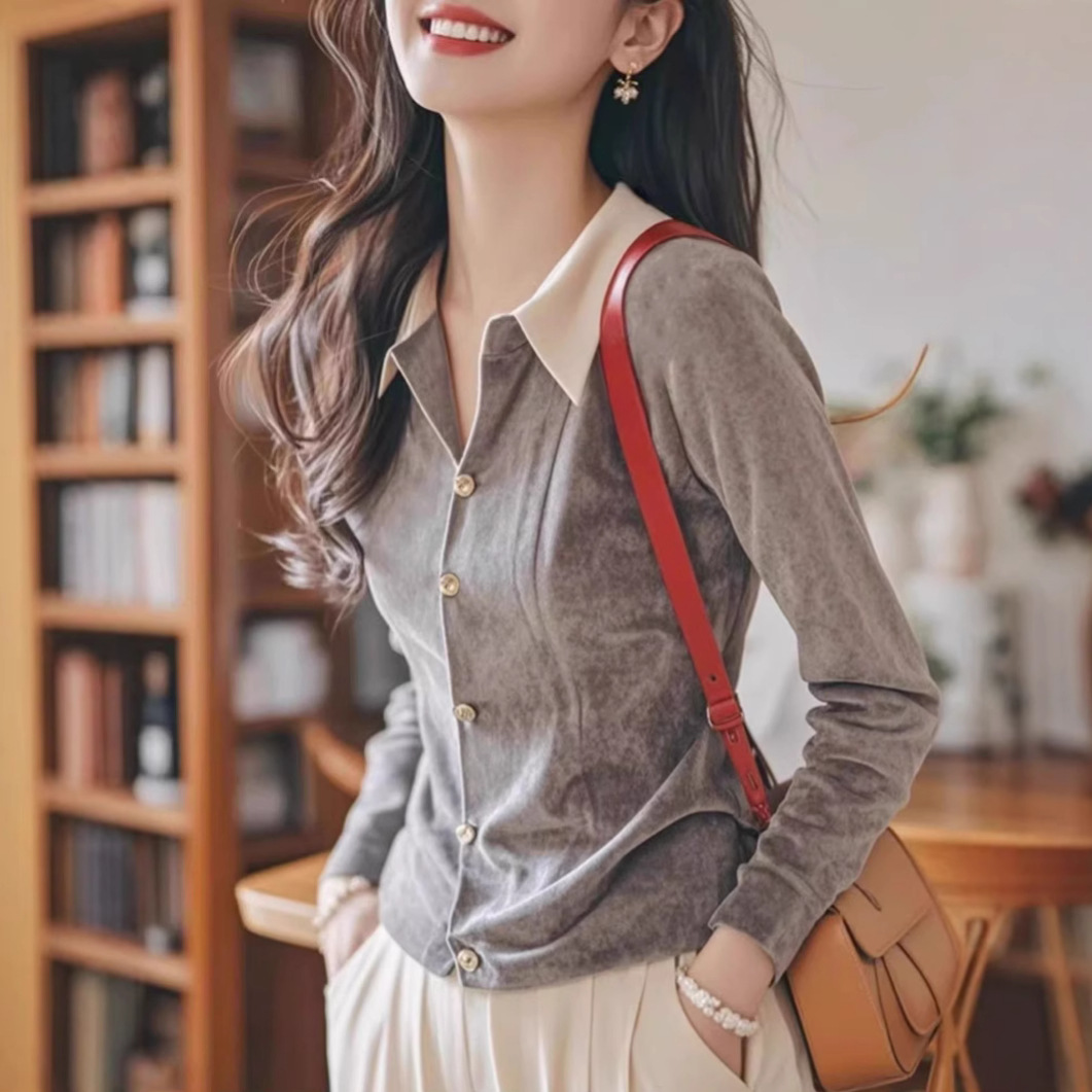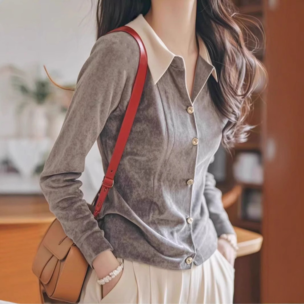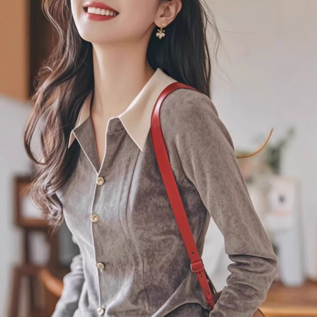 小柿子今年流行独特别致洋气减龄上衣轻熟法式灰色丝绒衬衫秋季