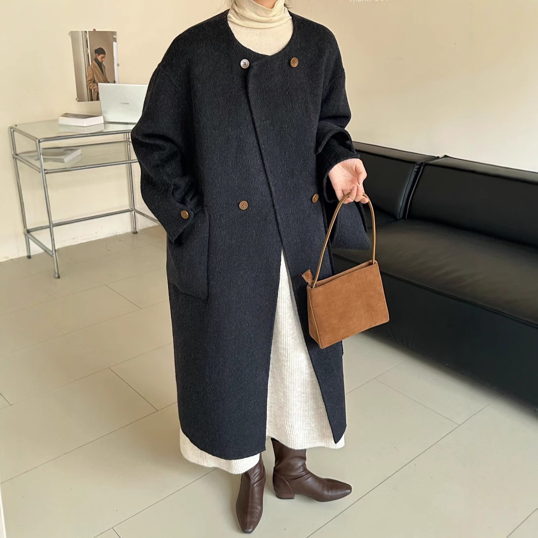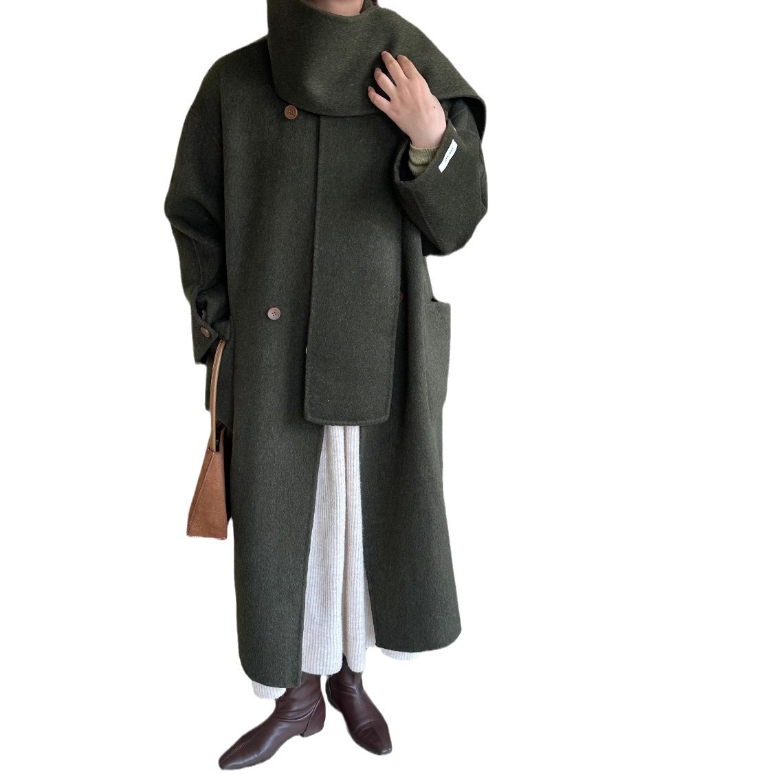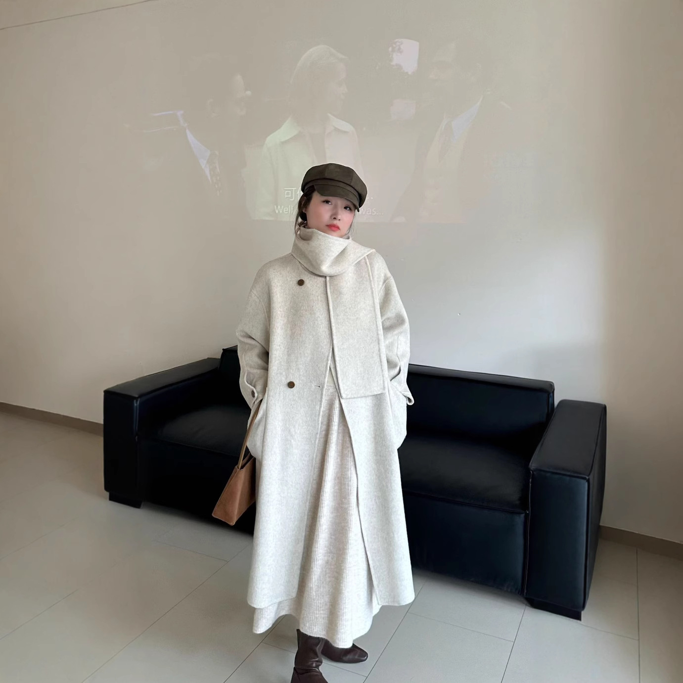 2024秋冬新款双面羊毛大衣韩版宽松时尚高级感围巾加长款毛呢外套