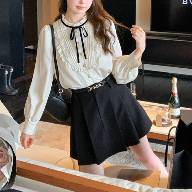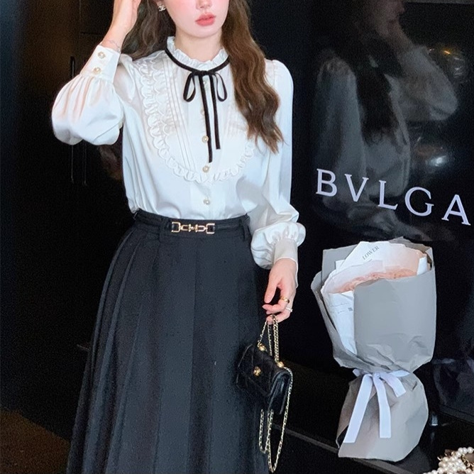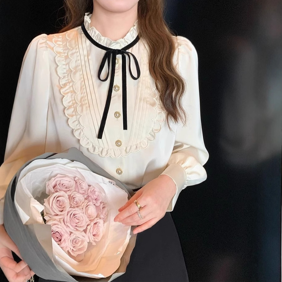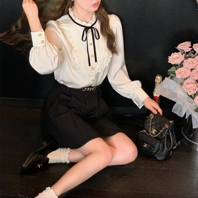 小柿子 法式复古千金风蝴蝶结系带白色木耳领衬衫女内搭长袖上衣