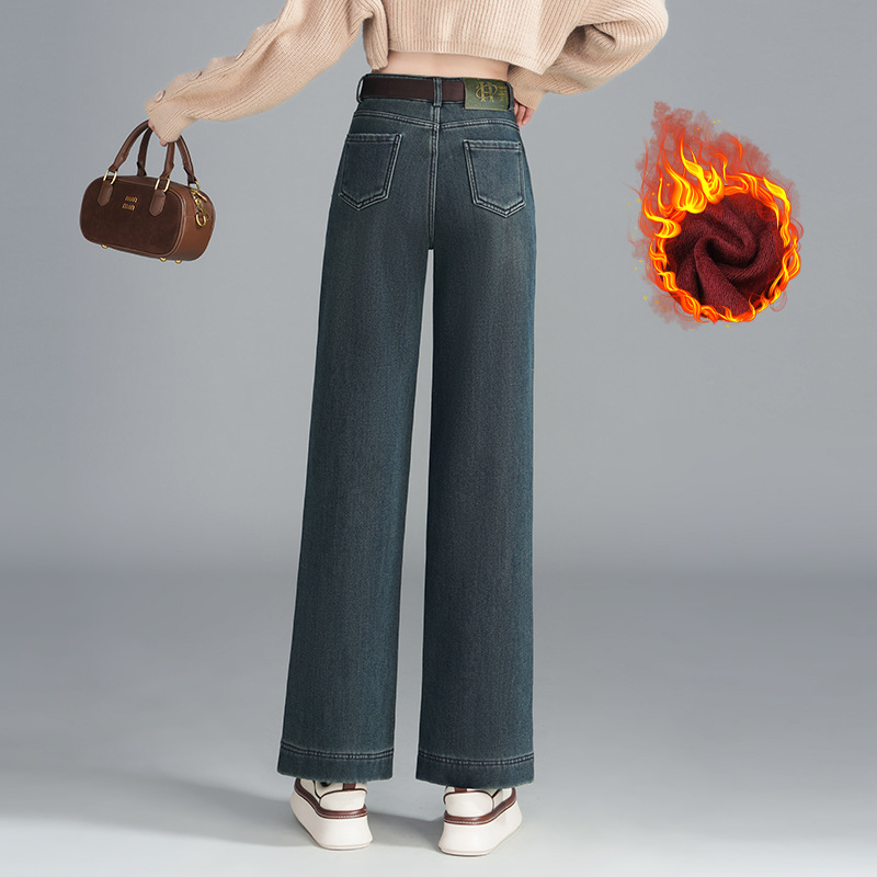 复古窄版阔腿牛仔裤女遮肉显瘦高腰直筒牛仔裤秋冬加绒加厚款保暖