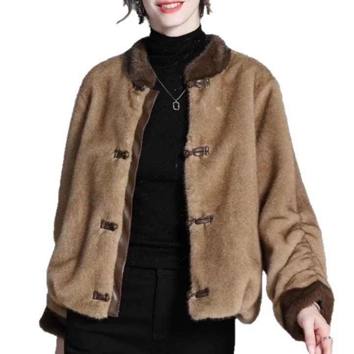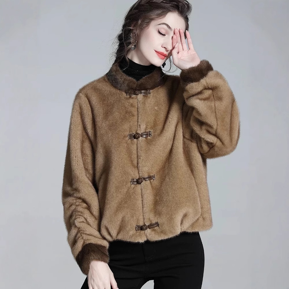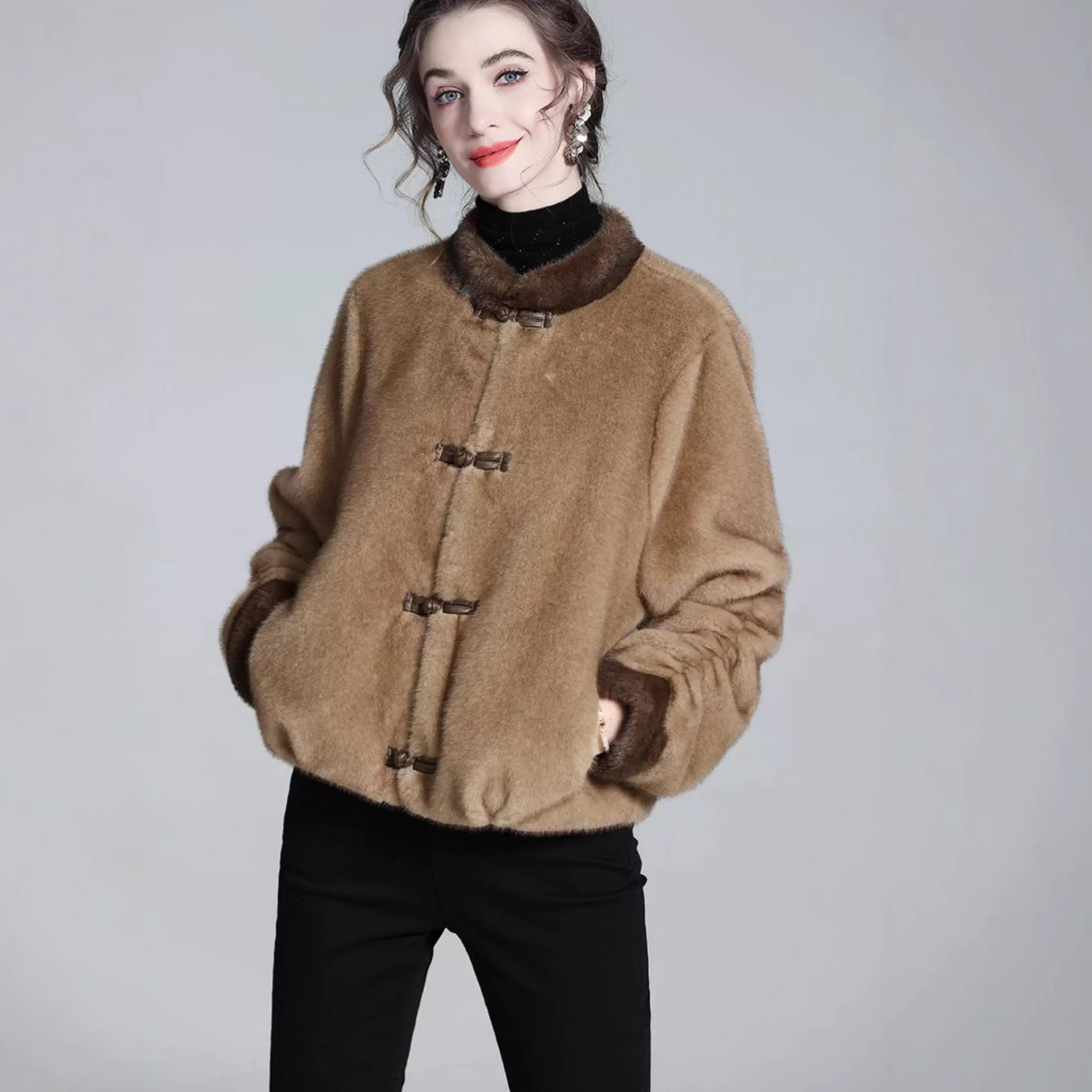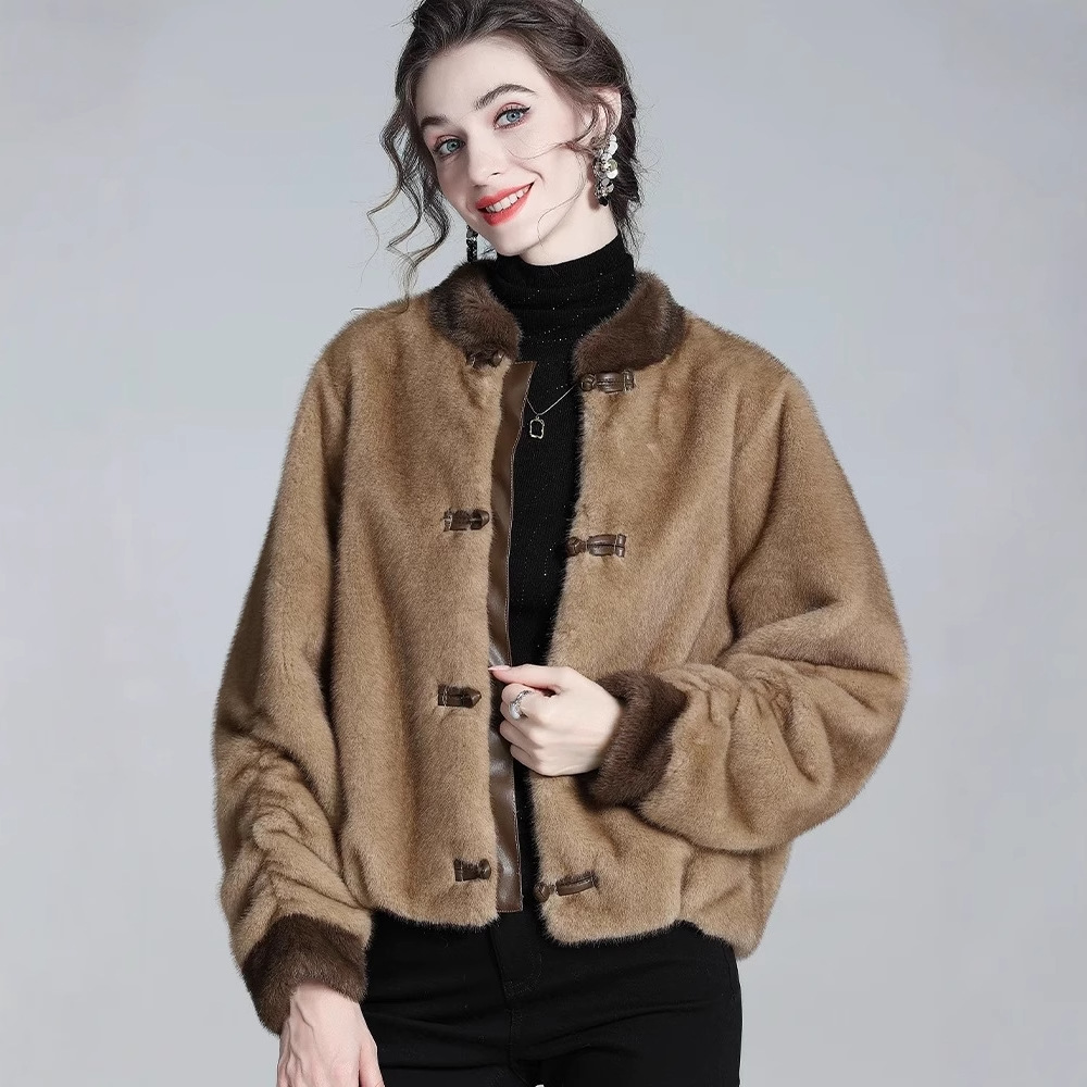 2025新款新中式盘扣海宁皮毛一体短款立领皮草大衣仿水貂绒外套女