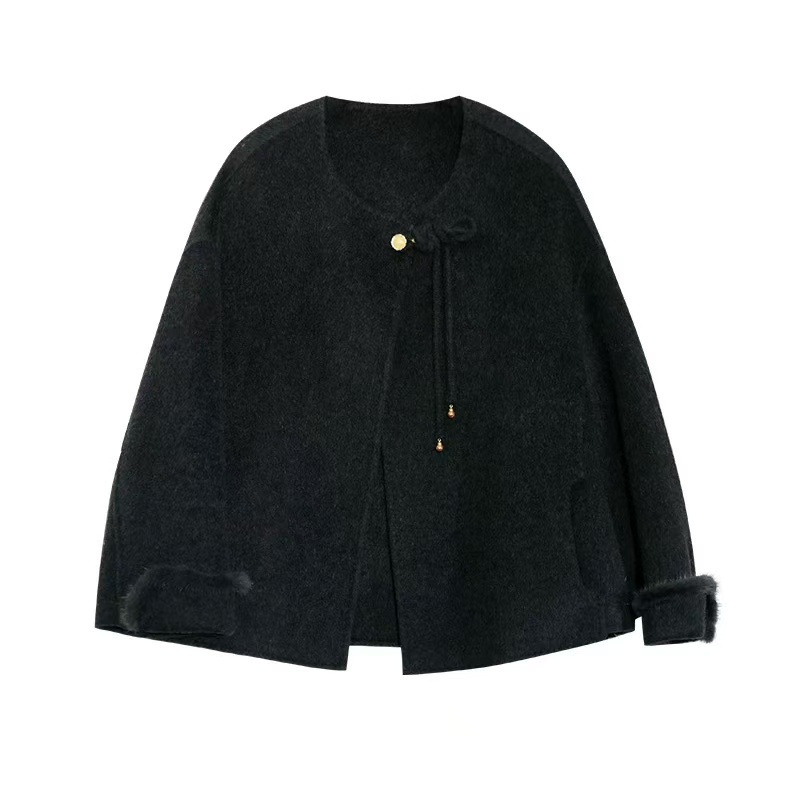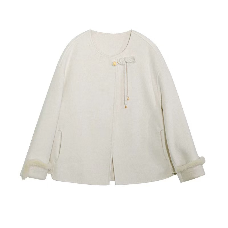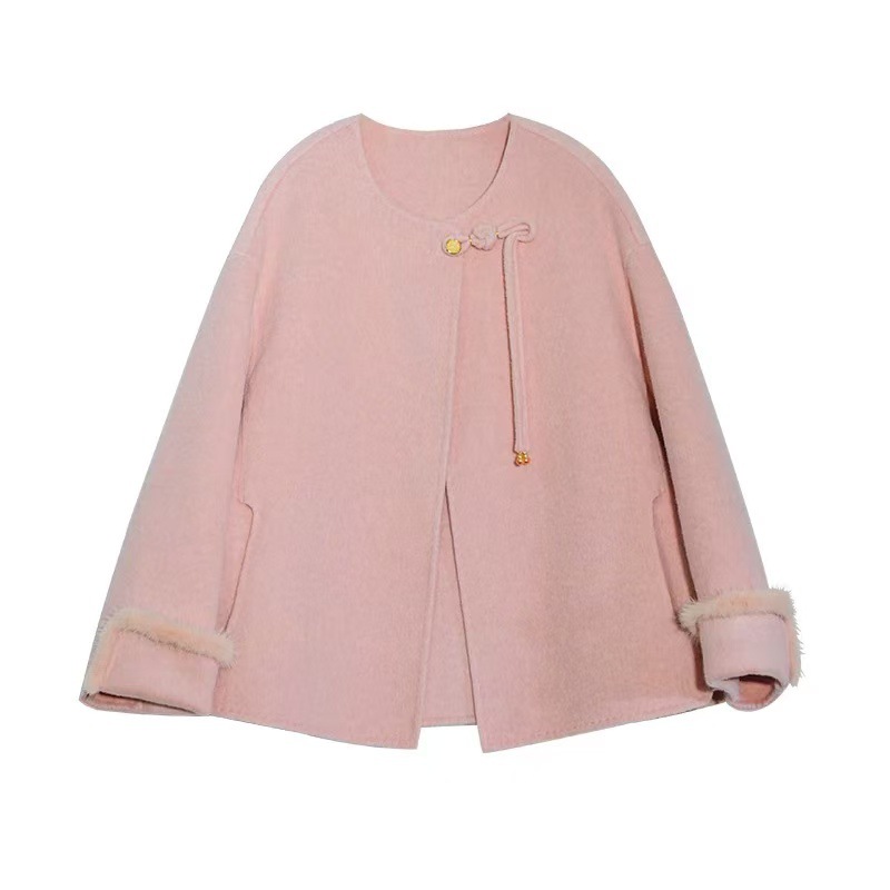 2024秋冬新款粉色双面羊毛大衣高端国风一口扣圆领羊毛呢外套韩版