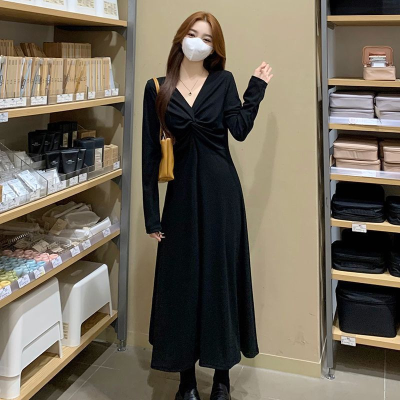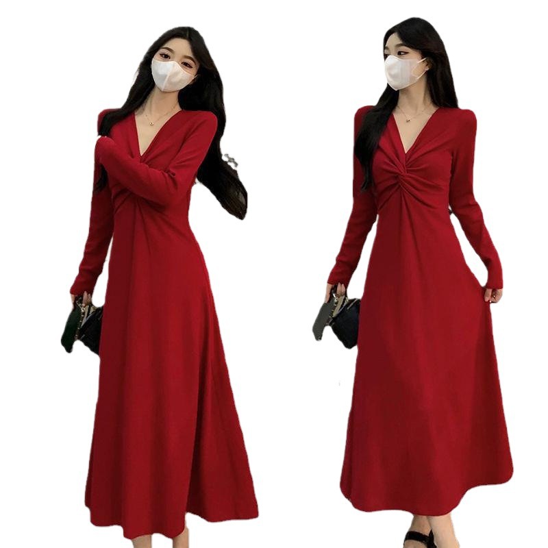 大码女装针织秋冬胖mm显瘦v领打底裙酒红色加黑色长款连衣裙性感