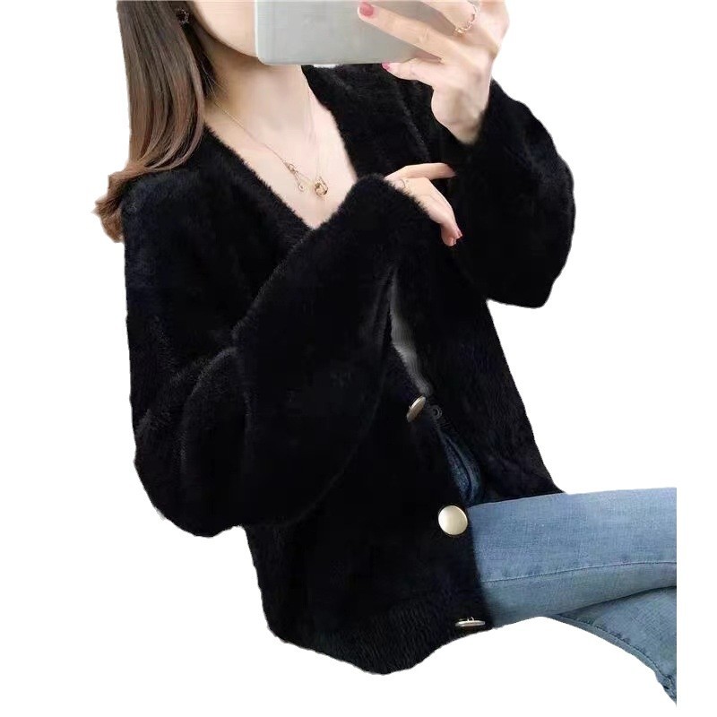 2024秋冬新款韩版仿水貂绒针织开衫外套毛衣女短款宽松外搭上衣女
