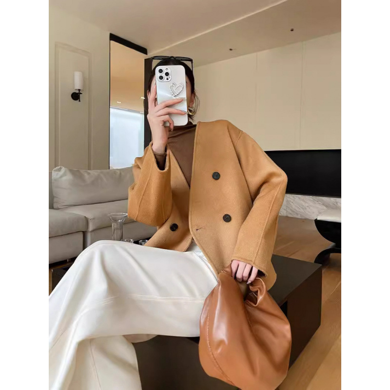 新年小香风V领双面尼羊毛大衣女短款ins宽松羊绒尼英伦风女装外套