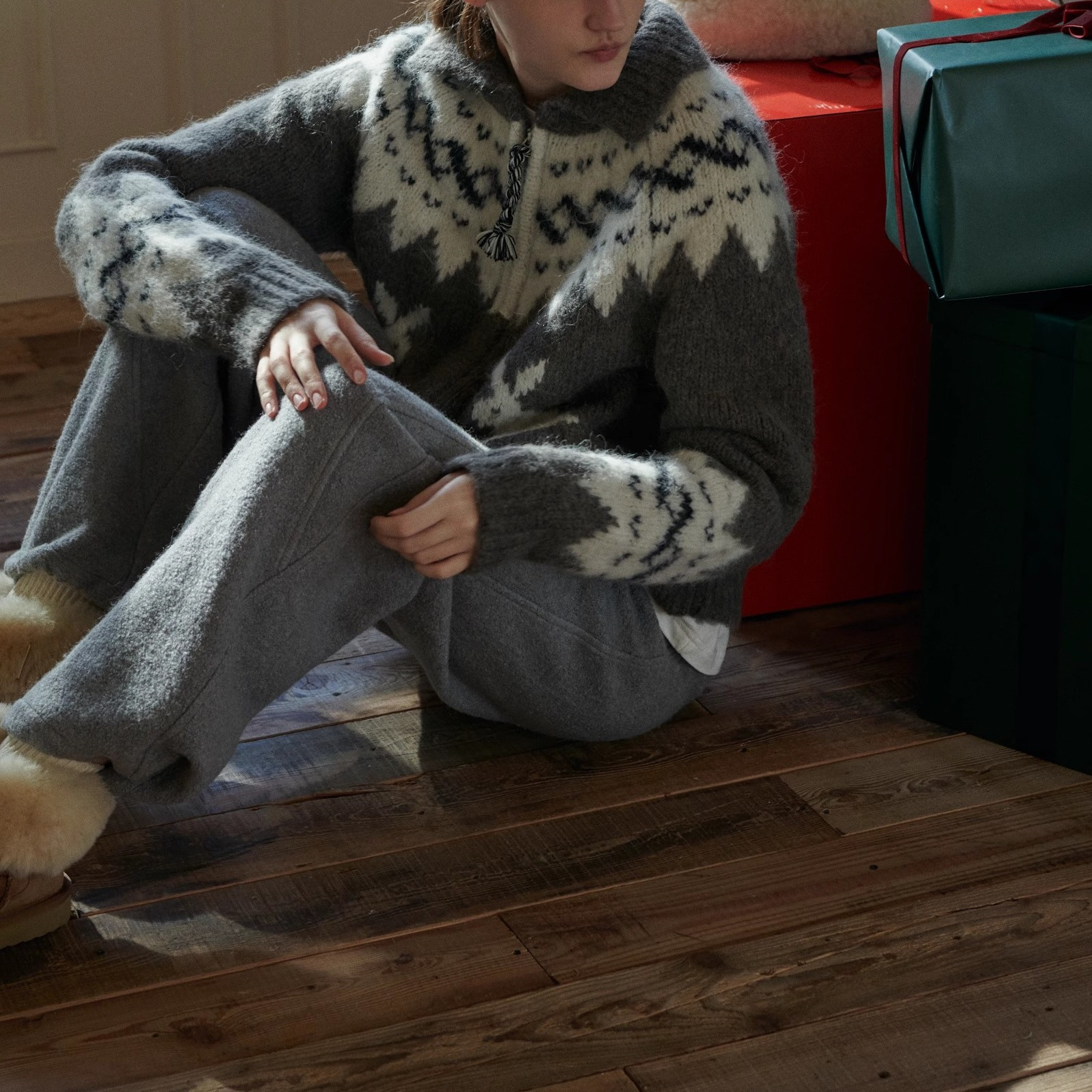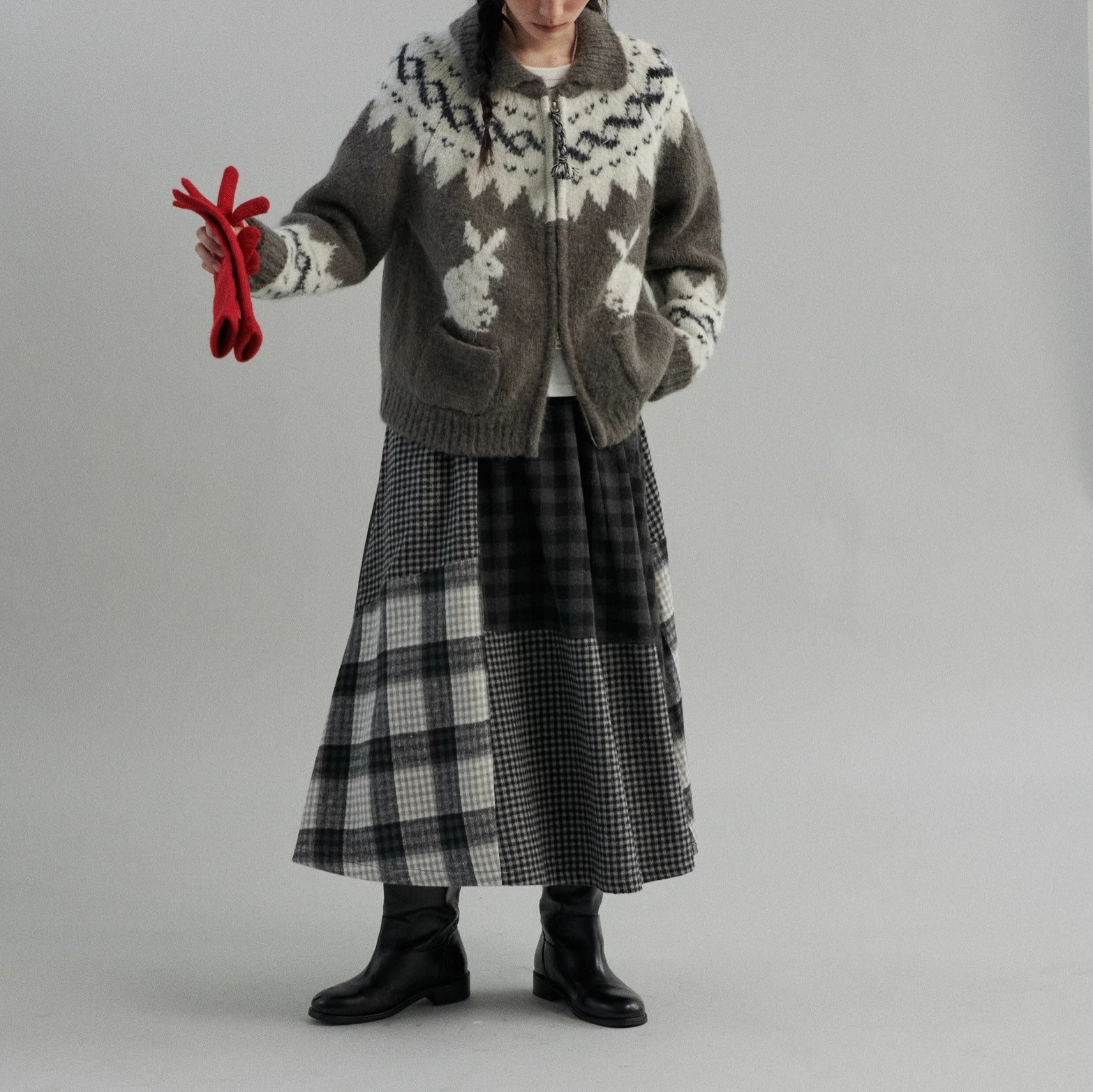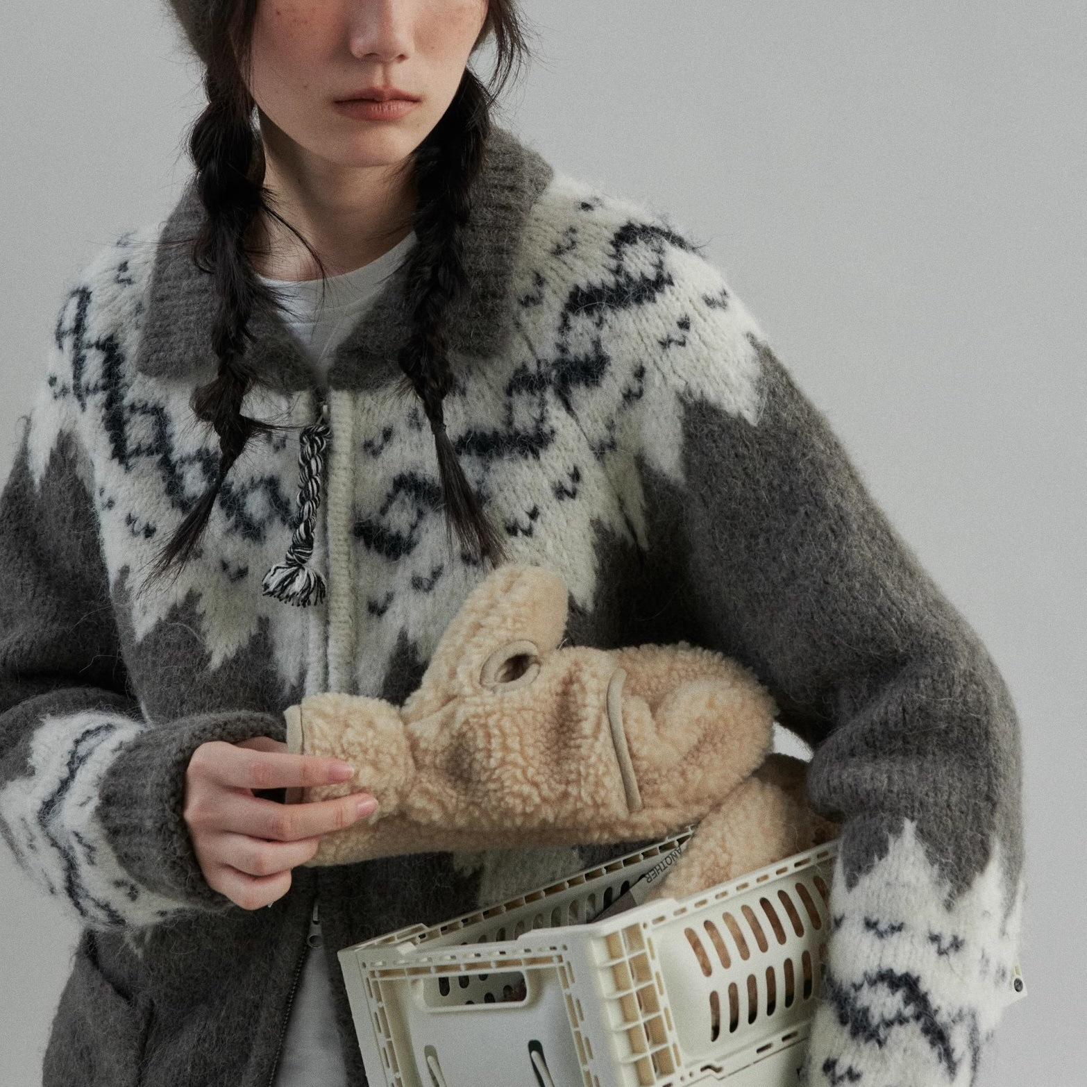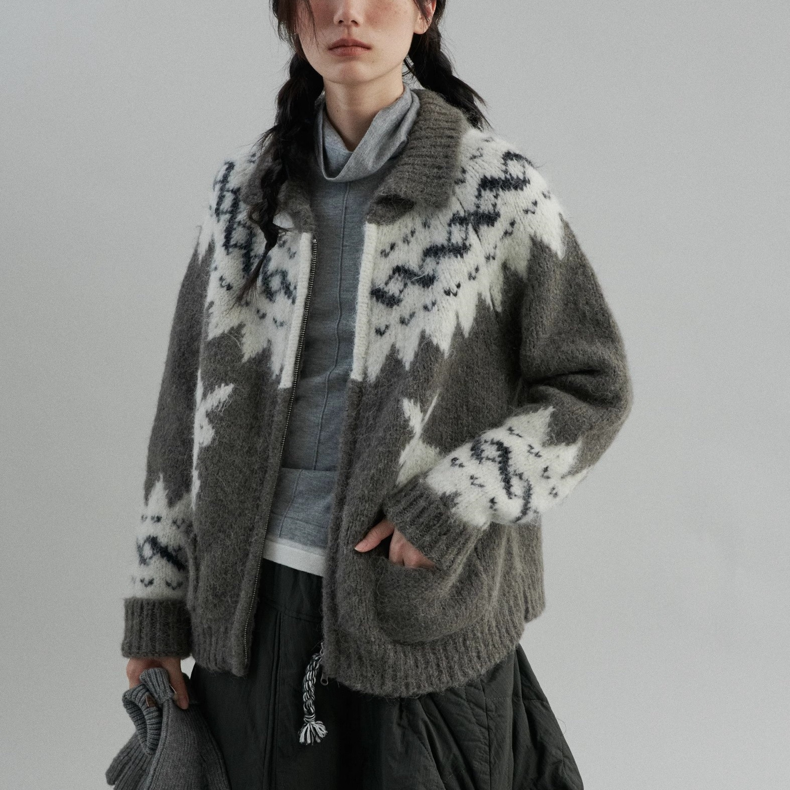 柔雾朦胧绒感摩天轮费尔岛羊驼毛兔子提花翻领开衫