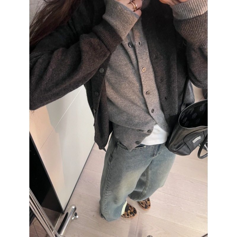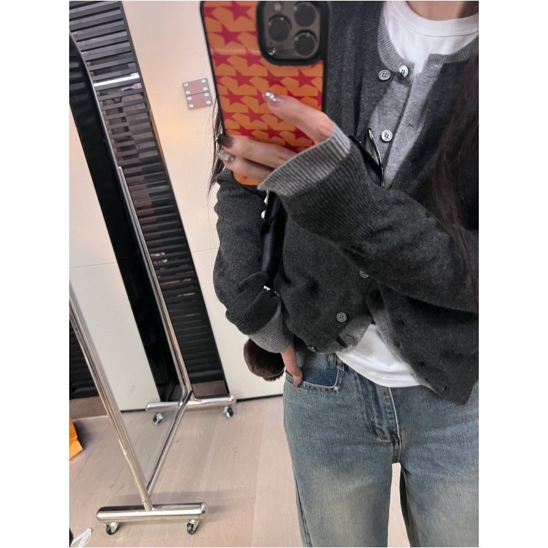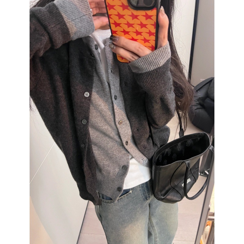 灰色假两件针织开衫毛衣外套女秋季圆领修身百搭设计感拼接上衣女