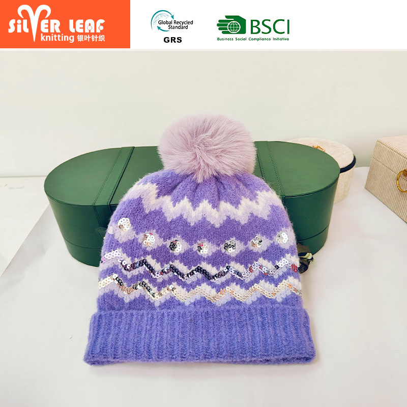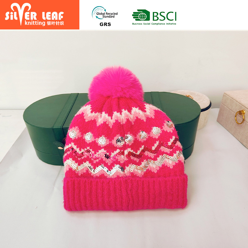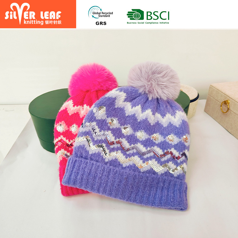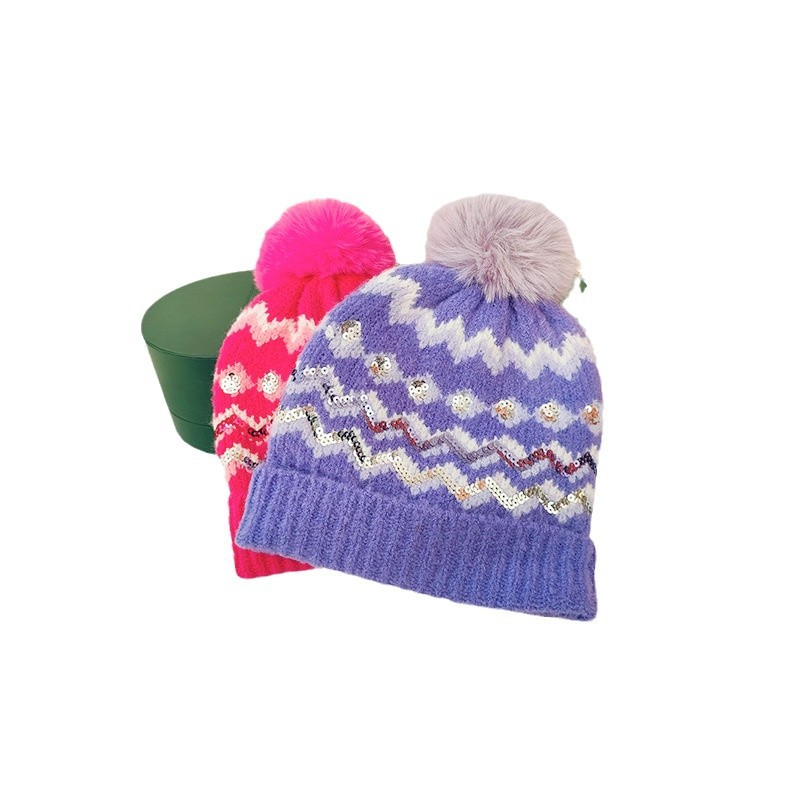 秋冬潮童帽 亮片提花针织帽毛球点缀双色可选 外贸出口 支持定 制