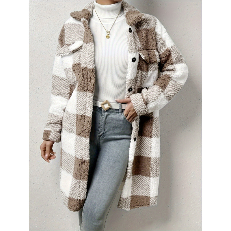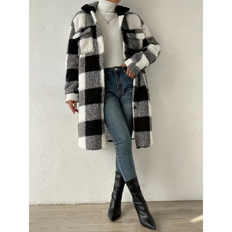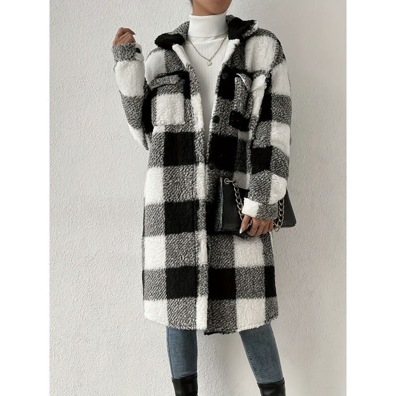 欧美跨境秋冬新款双面毛绒休闲格子长款翻领纽扣开衫外套女速卖通