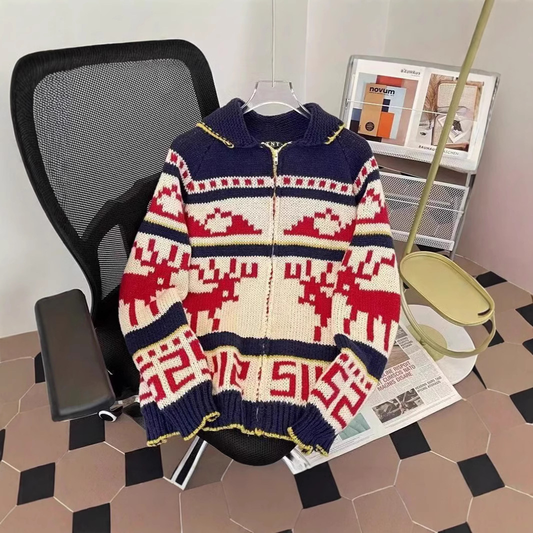 秋冬季圣诞麋鹿提花重工翻领针织开衫女生慵懒风休闲百搭毛衣外套