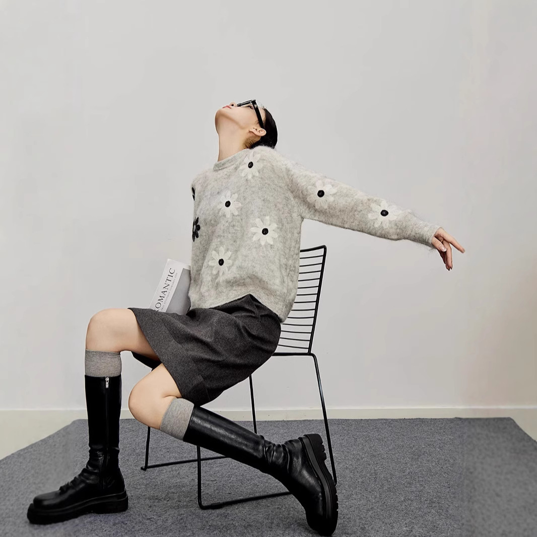 顾里里Guuli/花朵宽松长袖套头针织衫女2024秋冬新款灰色套头上衣