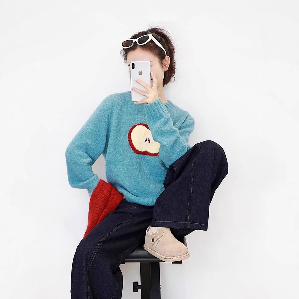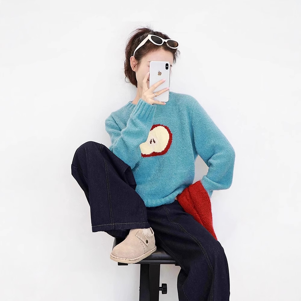 软糯蓝色提花圆领加厚毛衣女秋冬季慵懒高级感宽松软糯针织衫上衣