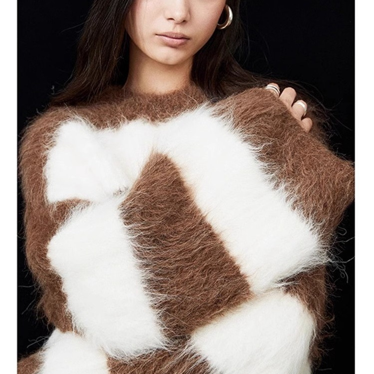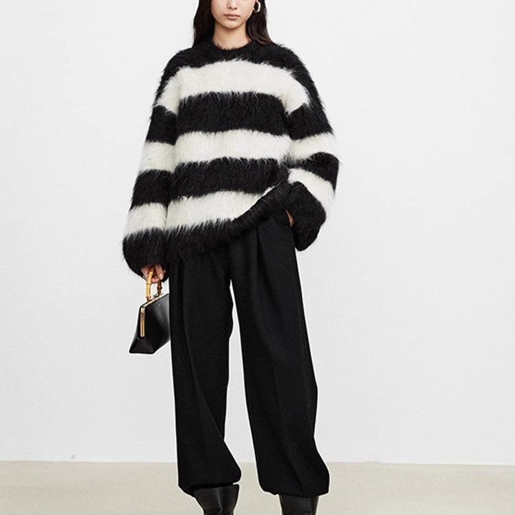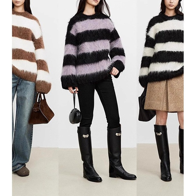 软糯奶fufu紫色条纹水貂绒圆领毛衣女秋冬加厚慵懒风短款针织上衣
