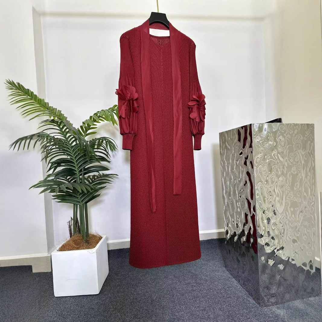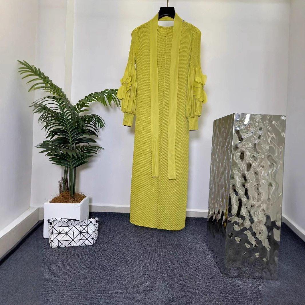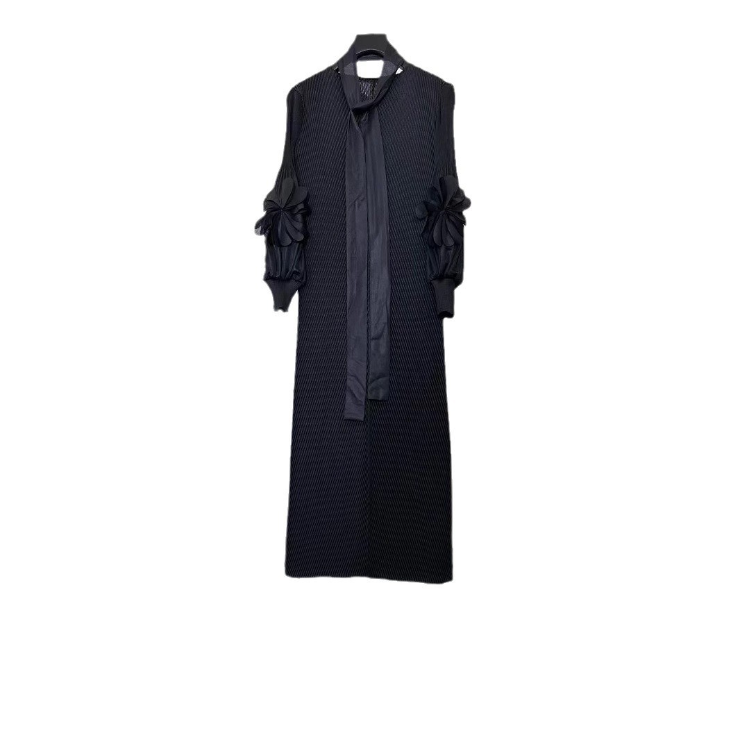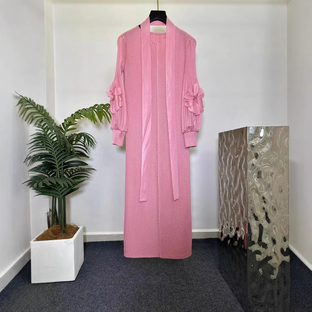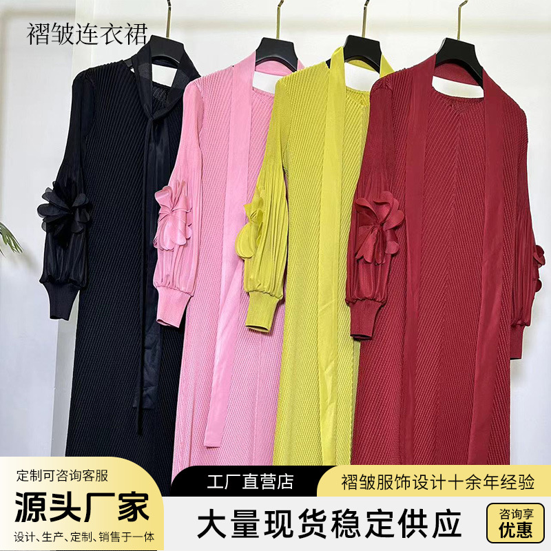三宅褶皱纯色连衣裙女小众轻熟风立体花宽松显瘦垂坠感欧美风长裙