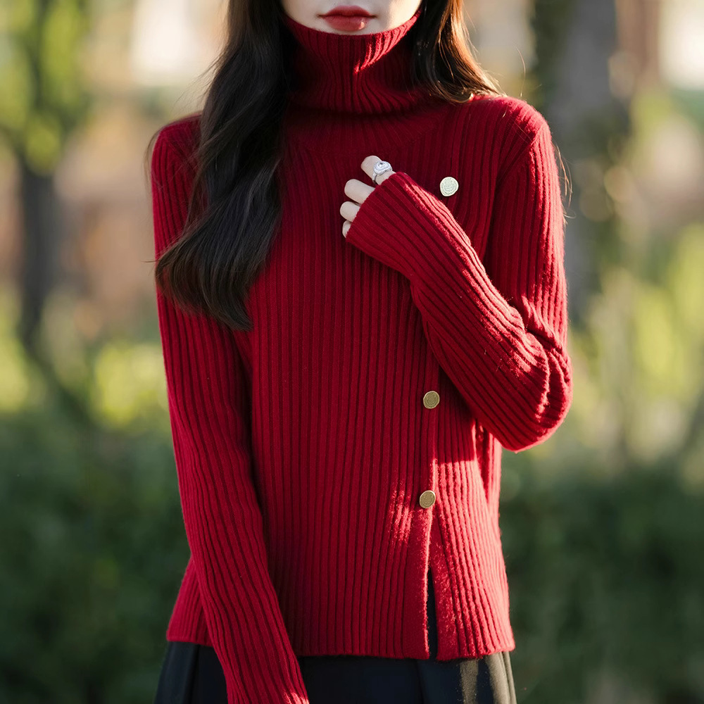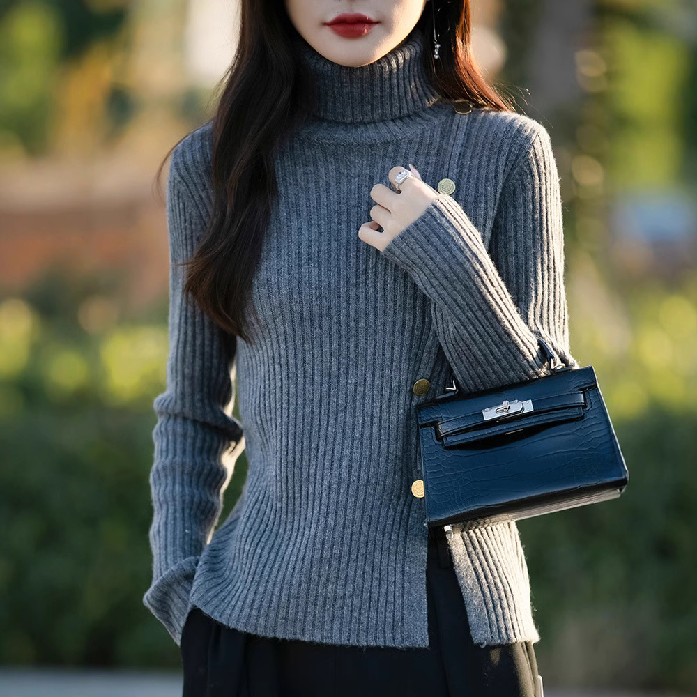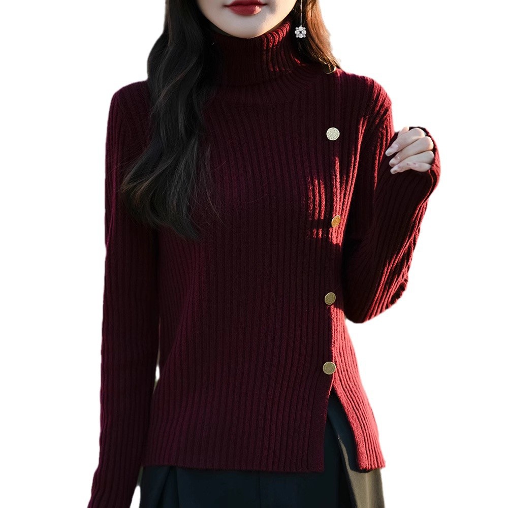 2024秋冬新款高领坑条设计感纽扣开叉打底衫时尚通勤针织衫女