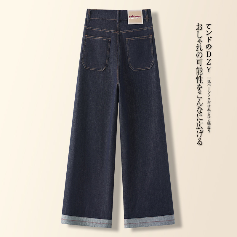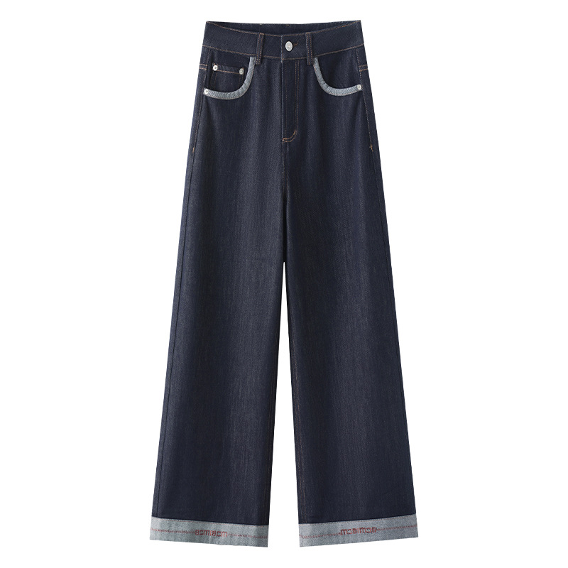 丹宁蓝窄版牛仔阔腿裤女2025春季新款高级感九分高腰刺绣直筒裤子