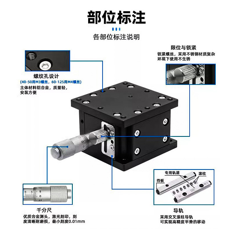 主营产品:手动位移平台千分头交叉导轨型精密微调滑台燕尾槽涡轮蜗杆齿轮齿条型调节平台R轴旋转滑台z轴升降平台