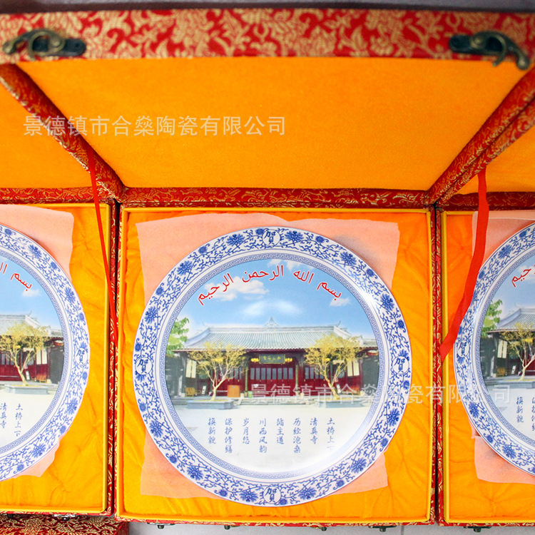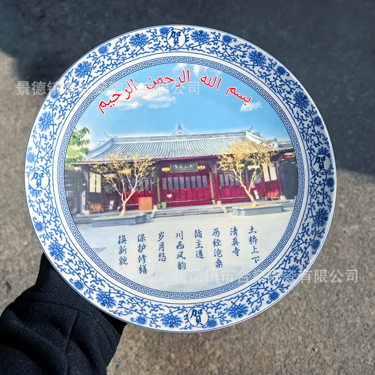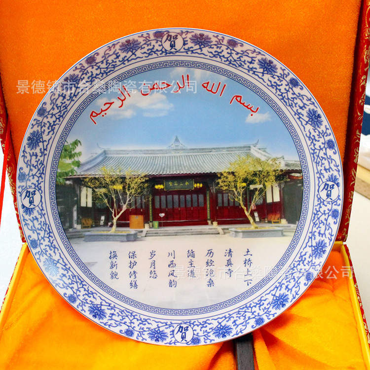 | 材质 | 白瓷 | 货号 | 四川成都土桥镇清真上寺保护修缮工程竣工纪念盘定制案例景德镇陶瓷赏盘加字 |