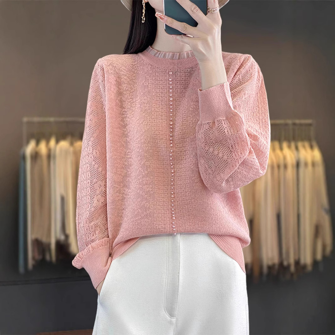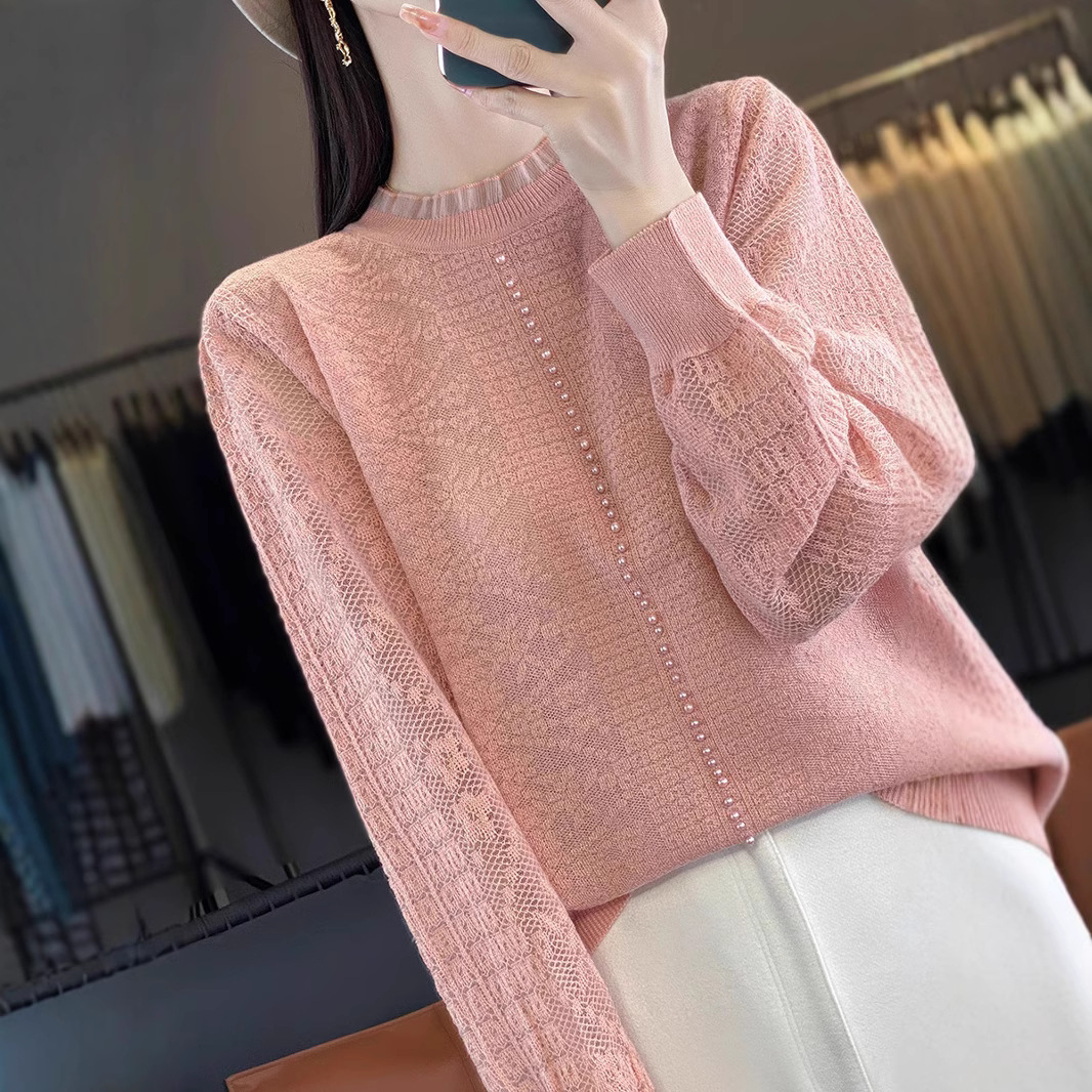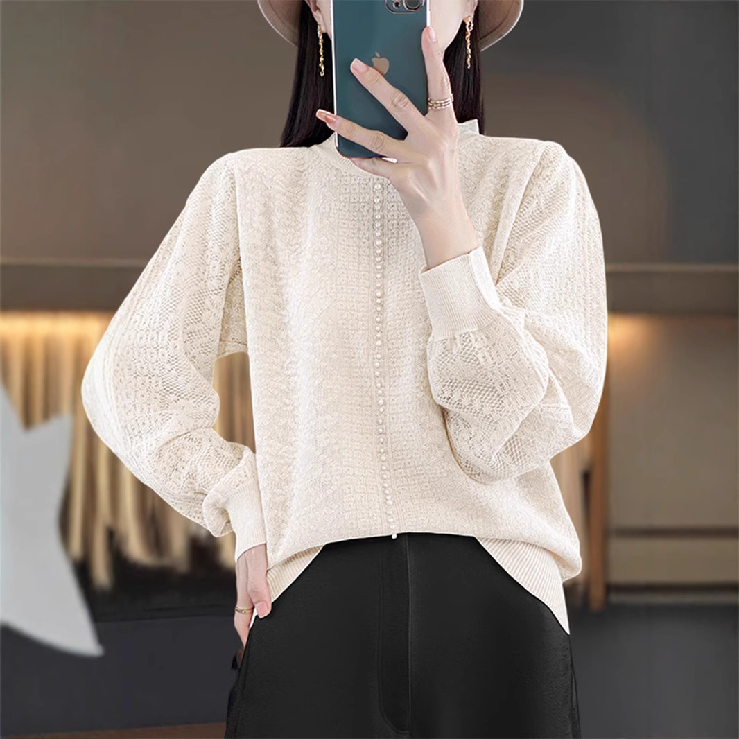 半高领针织打底女士蕾丝长袖春夏季宽松2024气质新款减龄甜美上衣