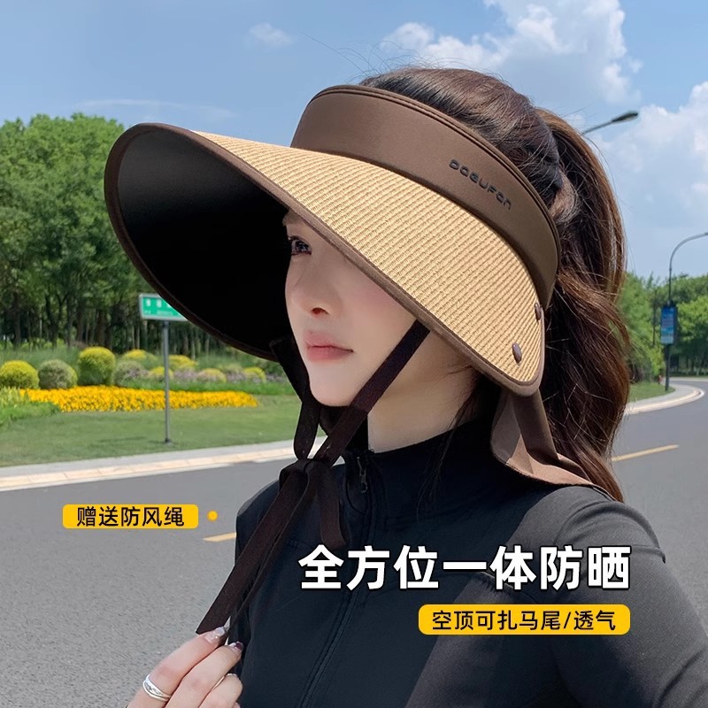 2025新款防晒帽女夏护颈防紫外线遮阳帽大帽檐户外草编空顶太阳帽