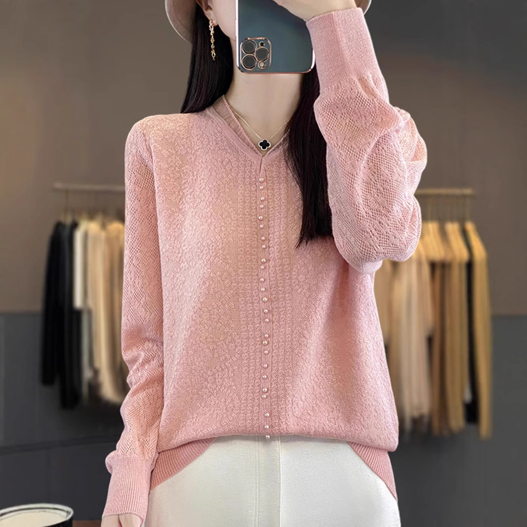 粉色毛衣打底衫套头长袖春夏薄款透气V领提花小香风针织衫小个子