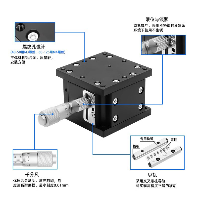 主营产品:手动位移平台千分头交叉导轨型精密微调滑台燕尾槽涡轮蜗杆齿轮齿条型调节平台R轴旋转滑台z轴升降平台
