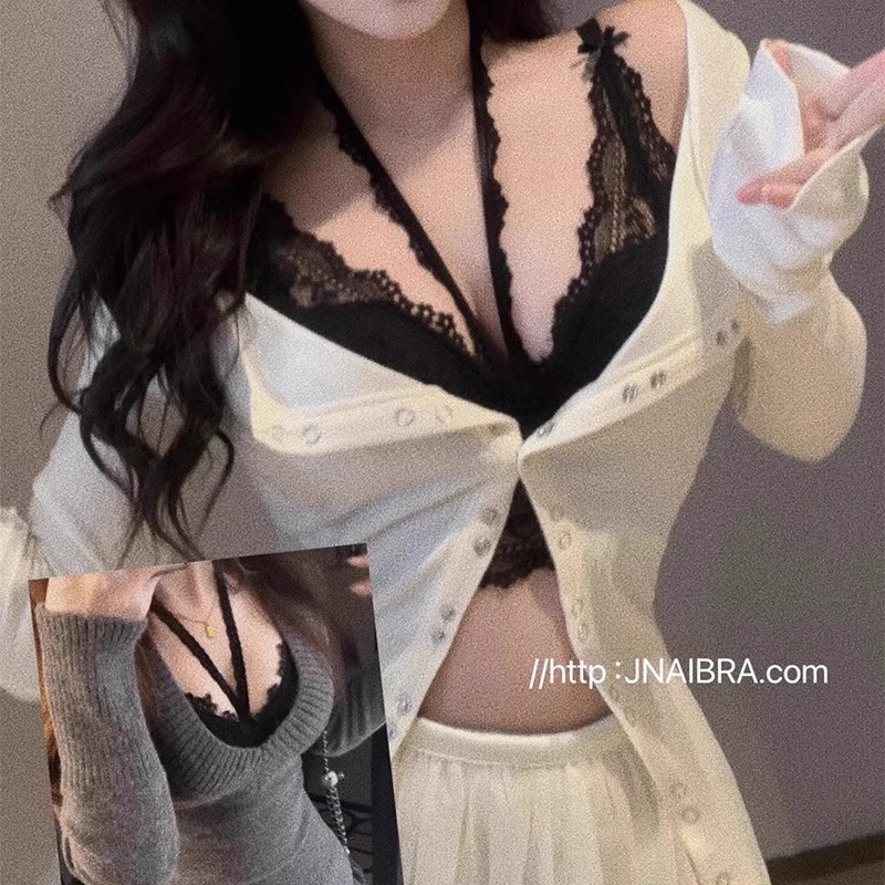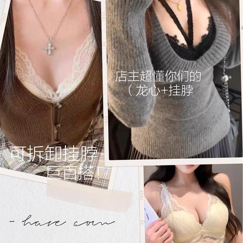 龙心蕾丝挂脖内衣女小胸聚拢纯欲法式性感叠穿吊带内搭胸衣文胸罩