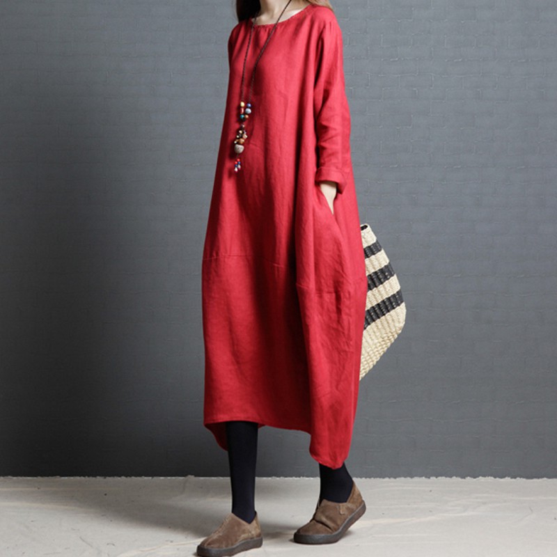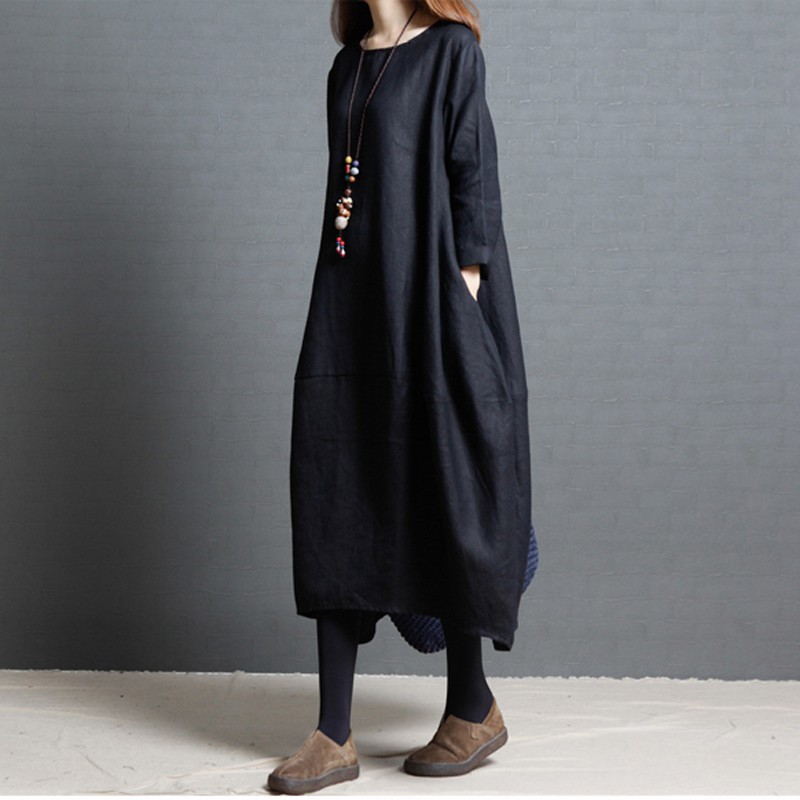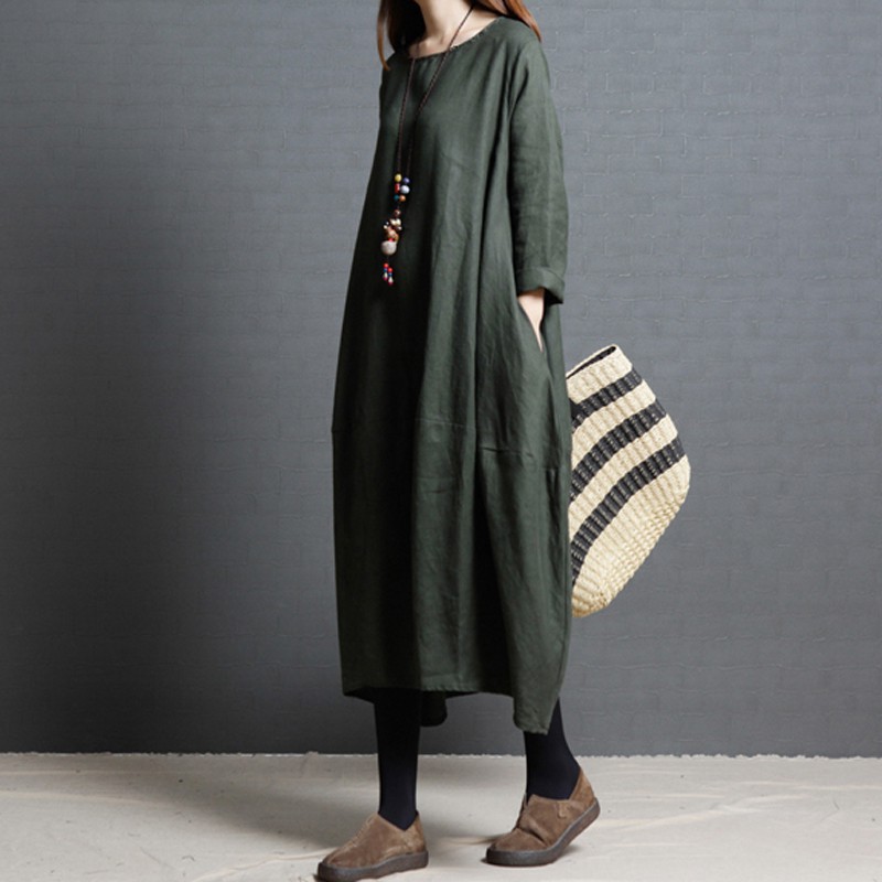 圆领春秋大码长款新款女装连衣裙韩版2023宽松长裙长袖棉麻