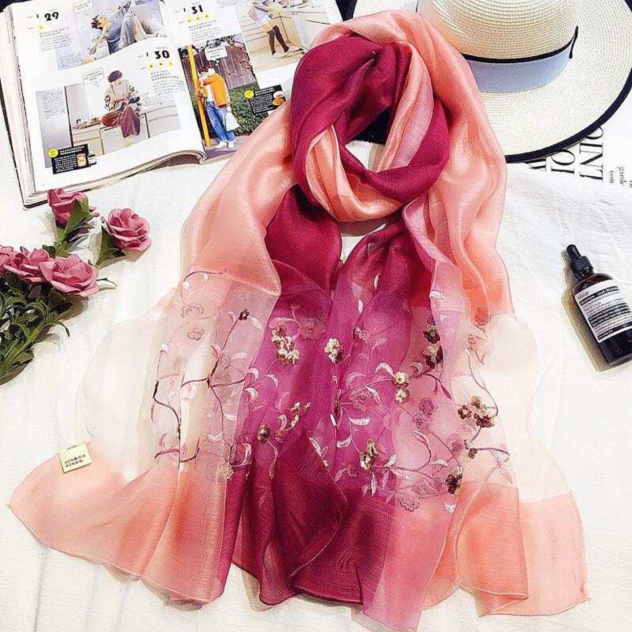 高档真丝羊毛刺绣丝巾批发 渐变色桑蚕丝绣花头巾丝毛围巾