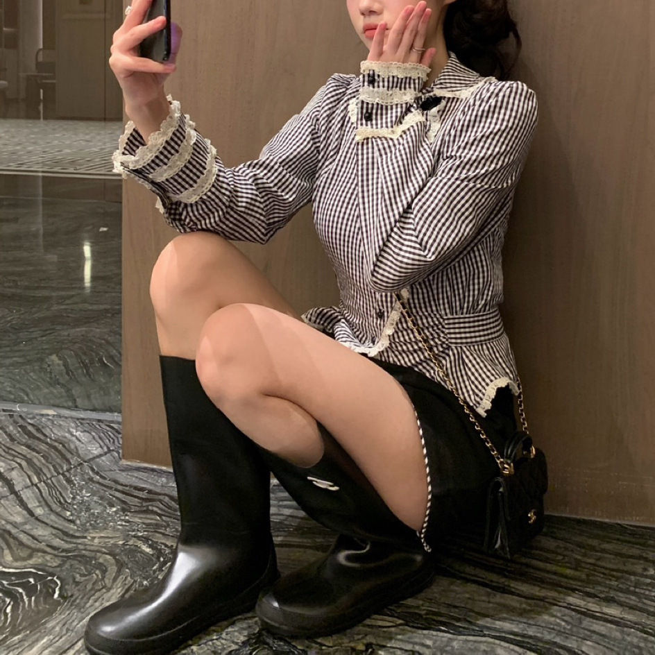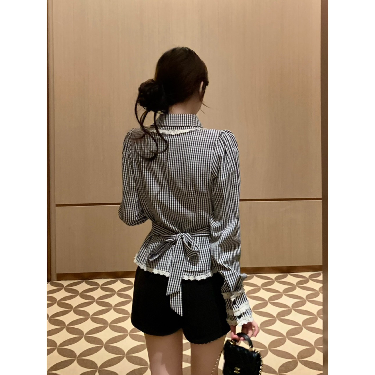 减龄少女格纹斜襟娃娃领显瘦衬衣+短裤长裤私服名媛御姐风