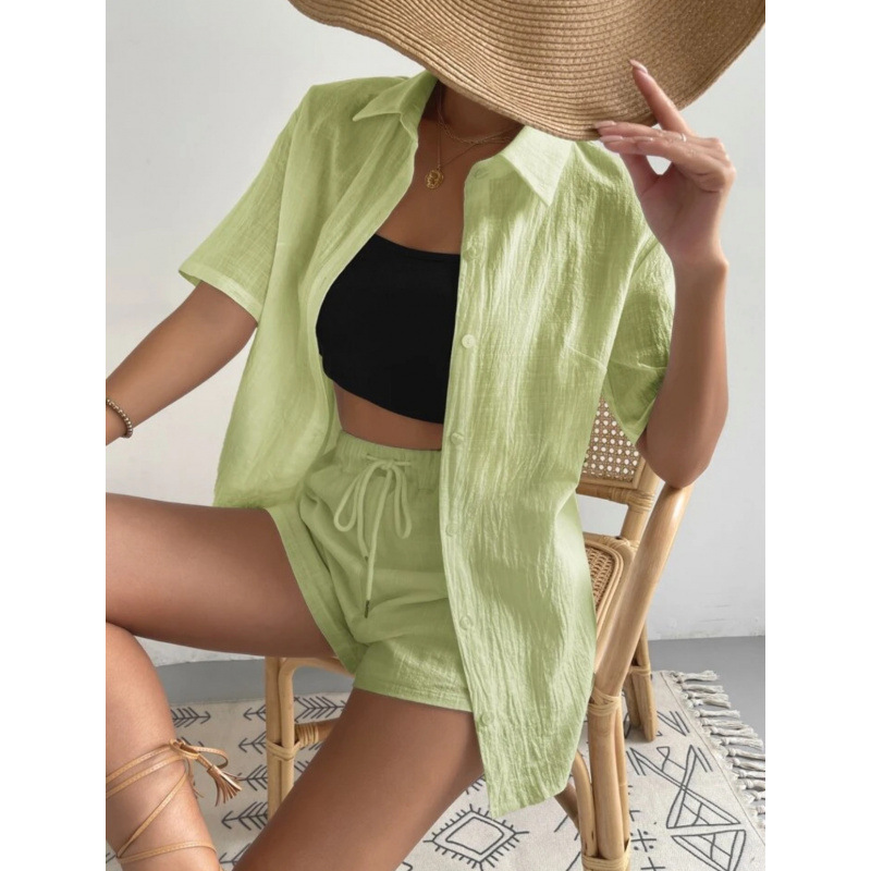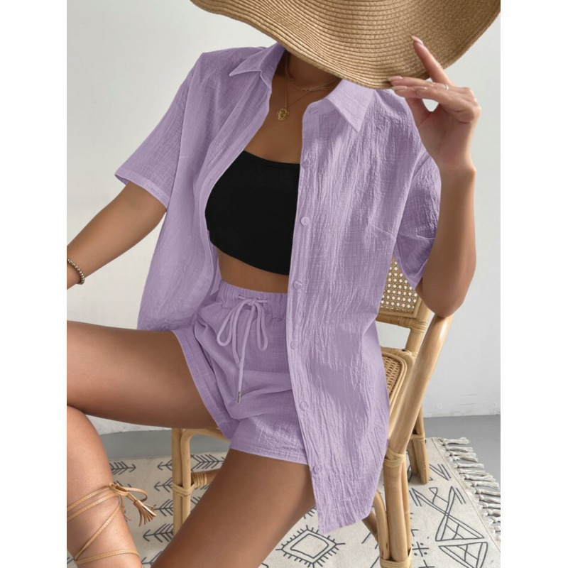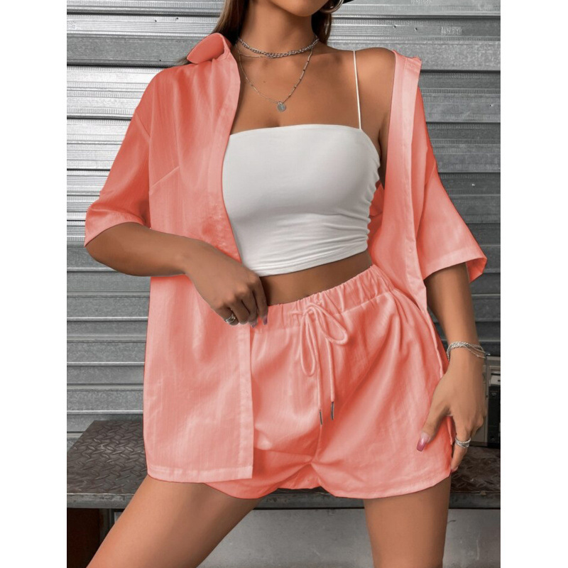 欧美新款2025外贸女装纯色单排扣短袖衬衣短裤宽松时尚休闲套装