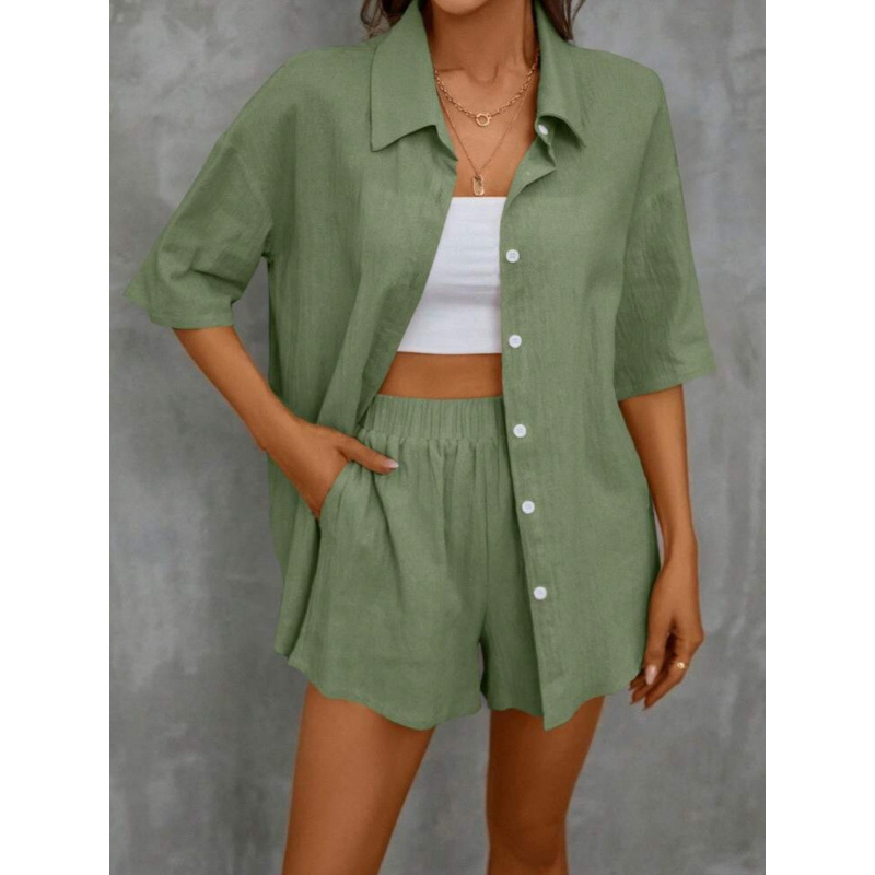 2025欧美外贸女装纯色单排扣翻领短袖衬衫休闲宽松短裤棉麻套装