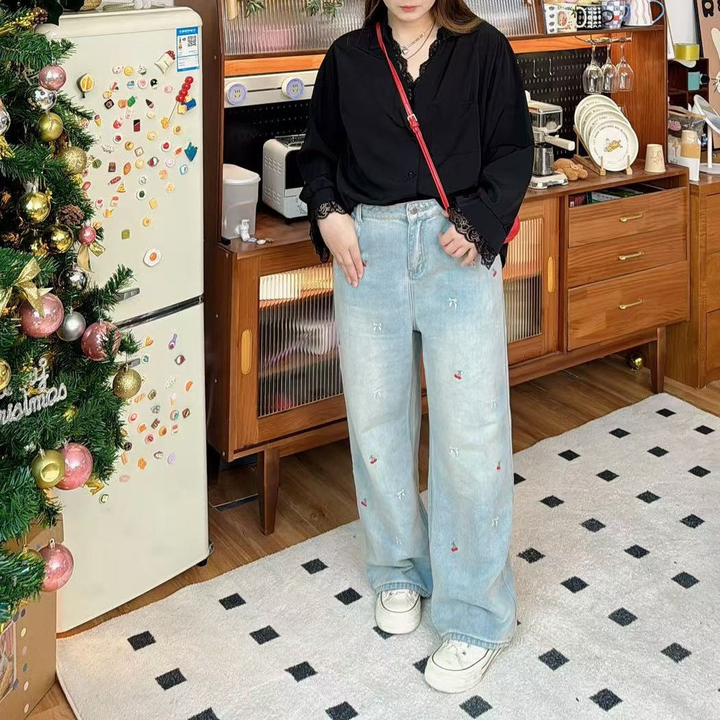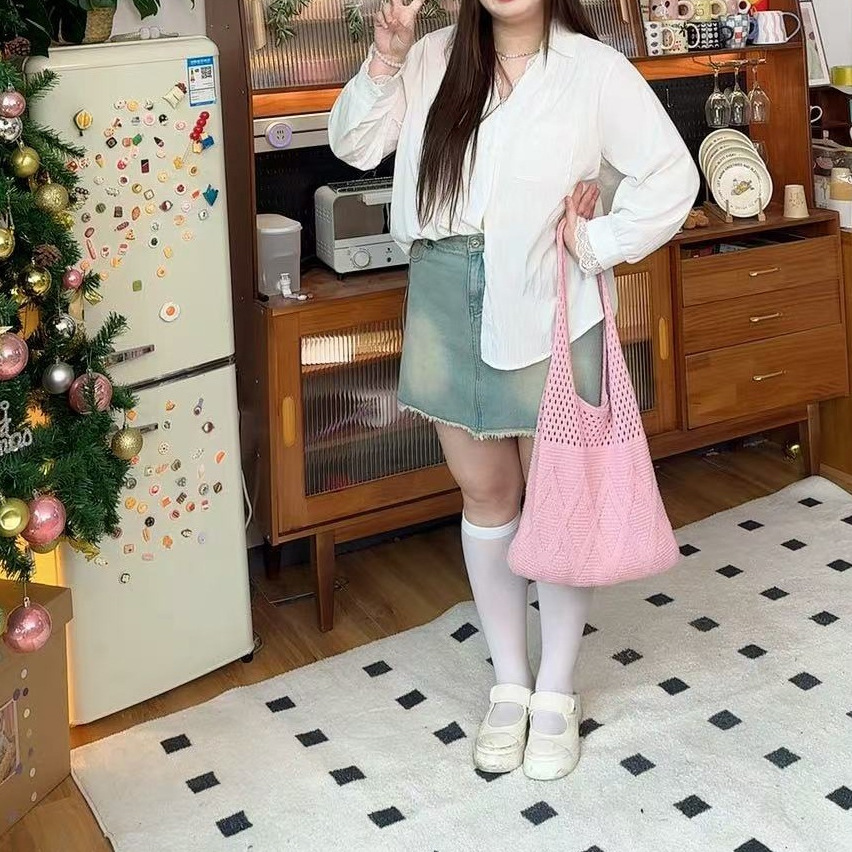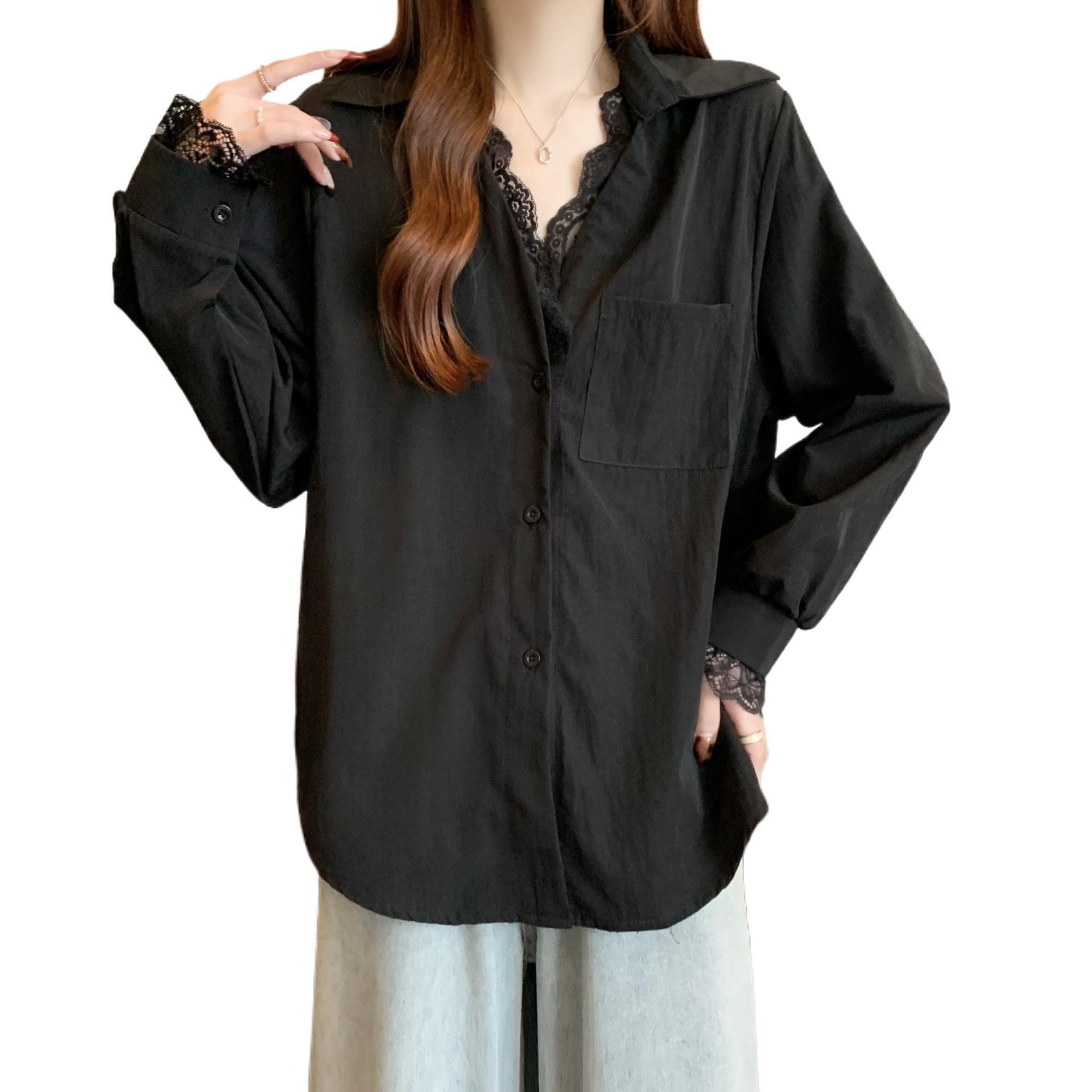 大码女装2025春季新款时尚花边单排扣口袋长袖衬衫白色黑色蓝色