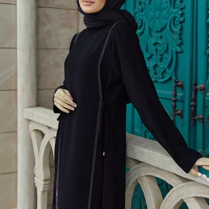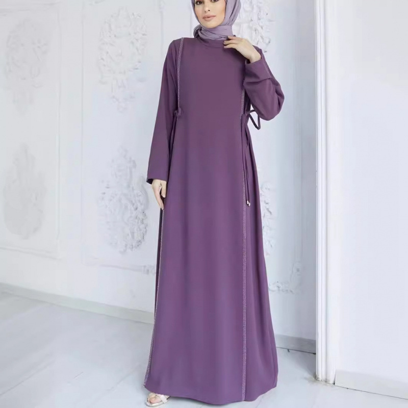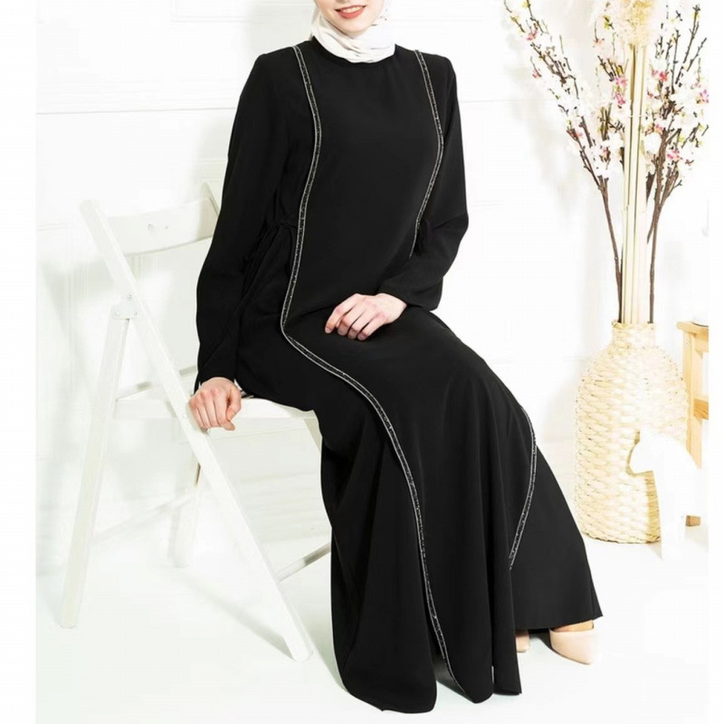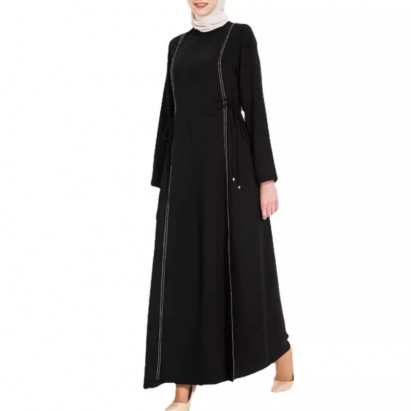 亚马逊独立站中东外贸简约女装长裙圆领宽松A字裙长袖花边连衣裙