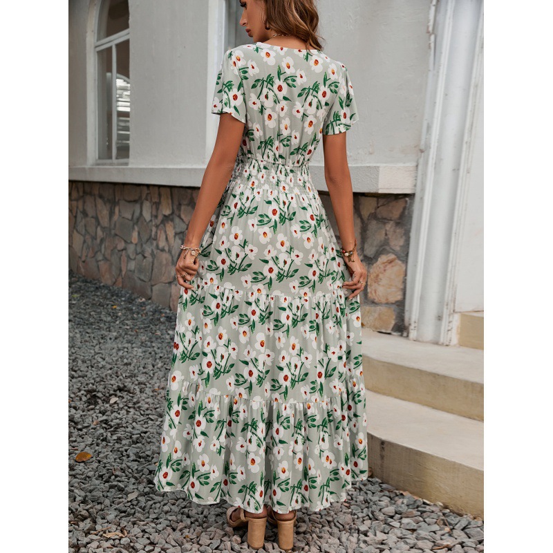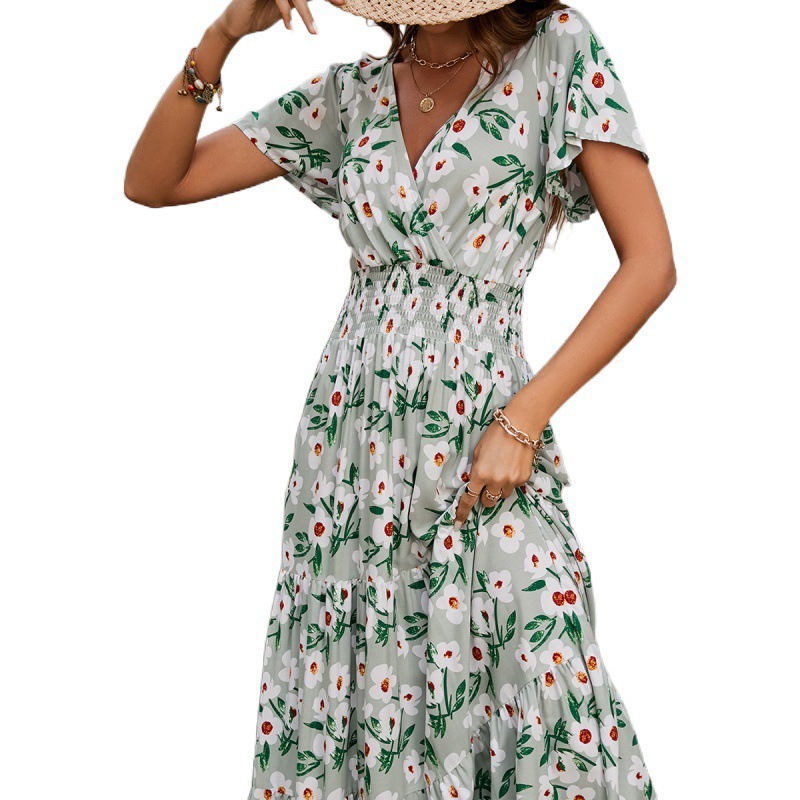 独立站TEMU跨境女装夏季新款v领短袖人棉印花连衣裙收腰大摆长裙