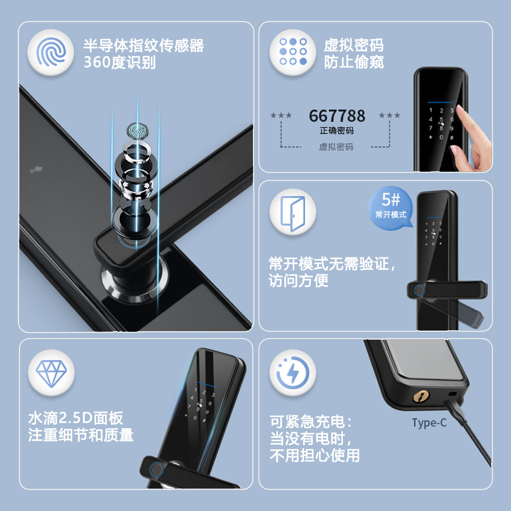 锁体 | 单舌或5050锁体 | | 多种方式解锁 | 指纹,密码,卡,钥匙,app |