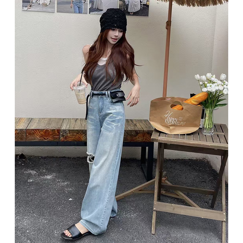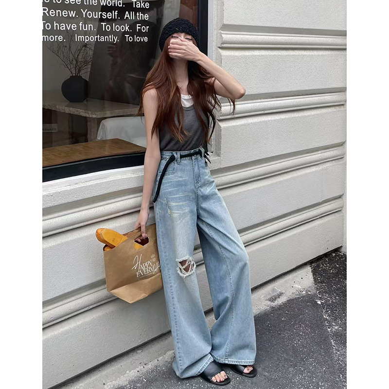 复古破洞直筒牛仔裤女高腰宽松显瘦春夏季梨型身材阔腿裤百搭长裤