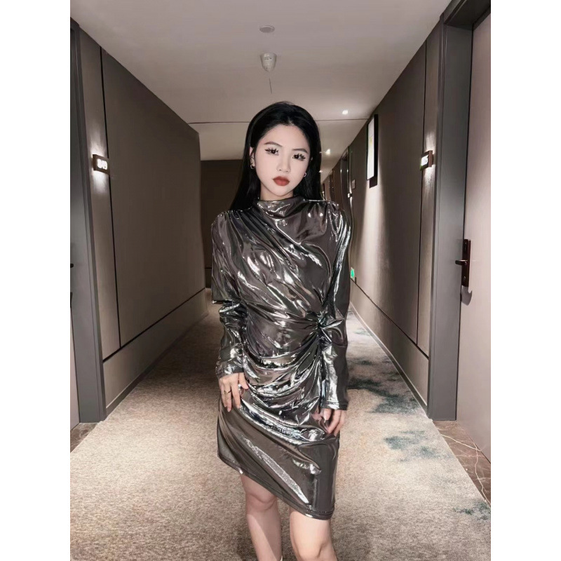 辣妹紧身褶皱长袖连衣裙春季新款亮眼时尚潮流街头显瘦性感