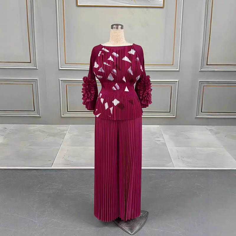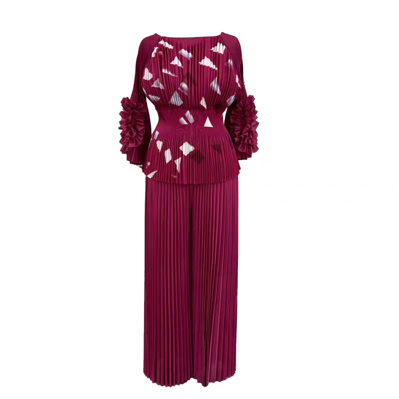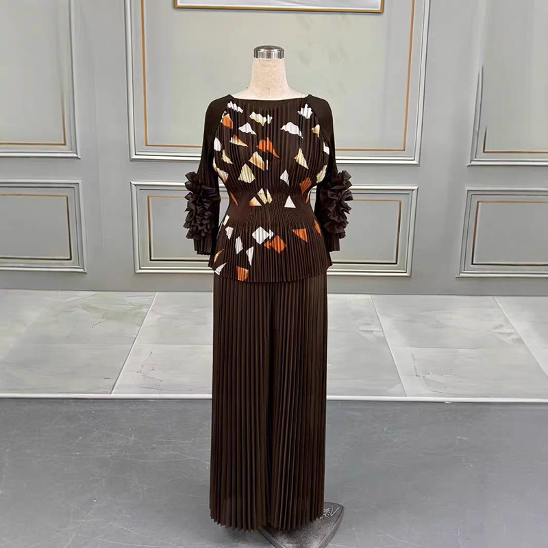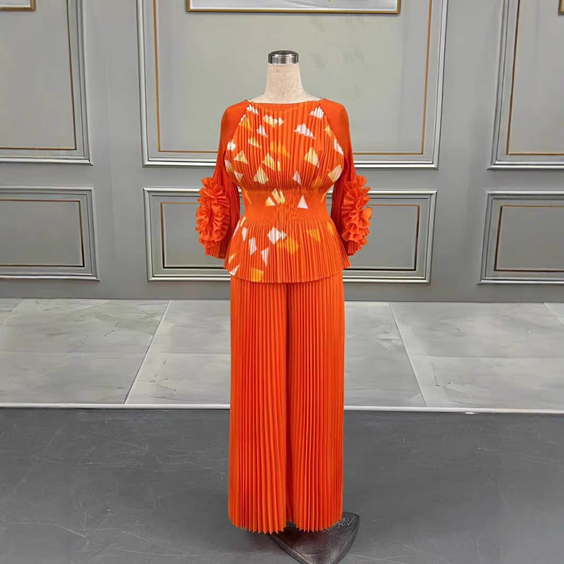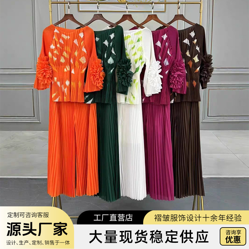 三宅大码女装显瘦套装高级感褶皱印花上衣休闲裤两件套跨境欧美风