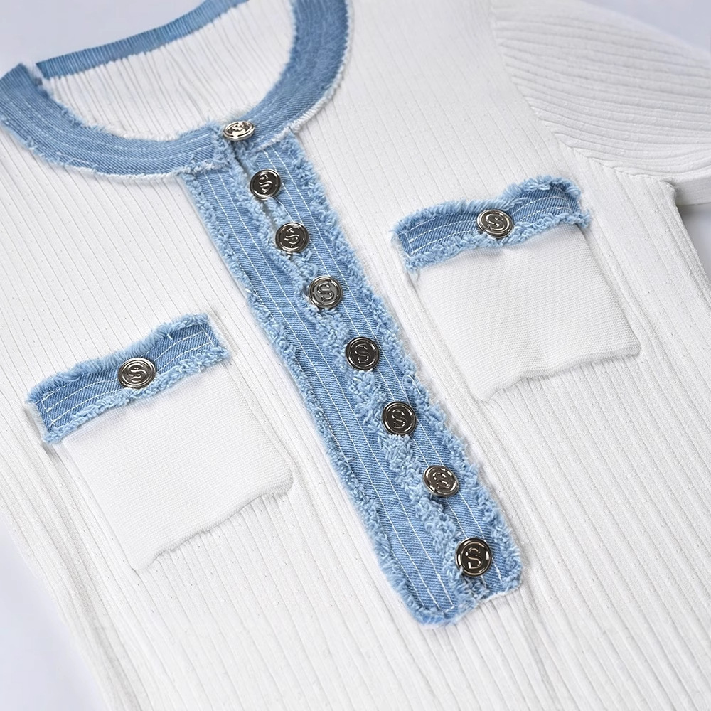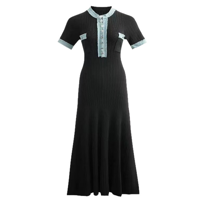 跨境欧美风夏季女装新款时尚圆领牛仔单排扣拼接针织短袖连衣裙