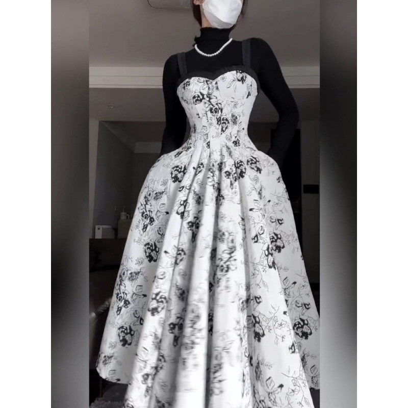 大码法式名媛复古碎花吊带连衣裙小众高级感重工收腰长裙时尚套装