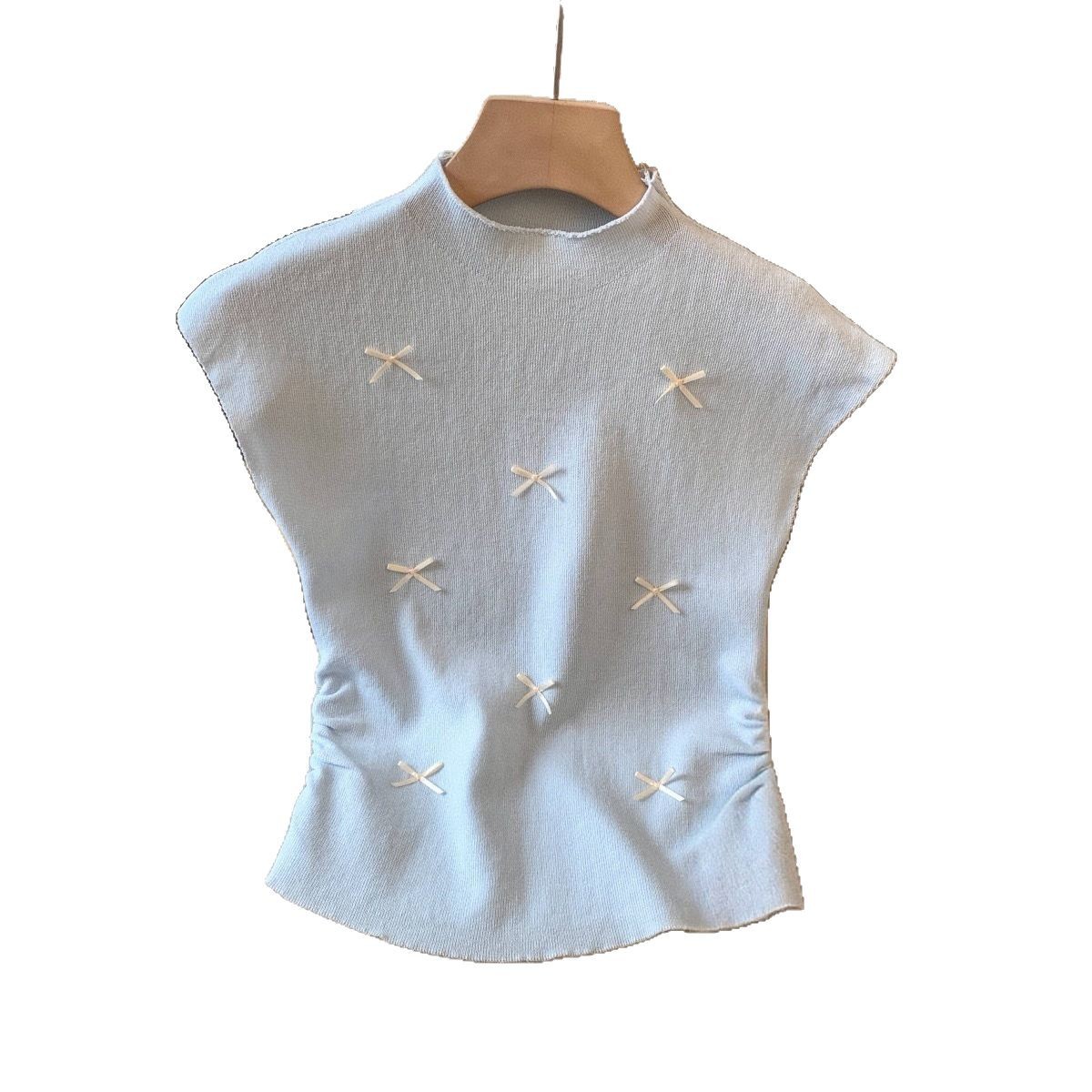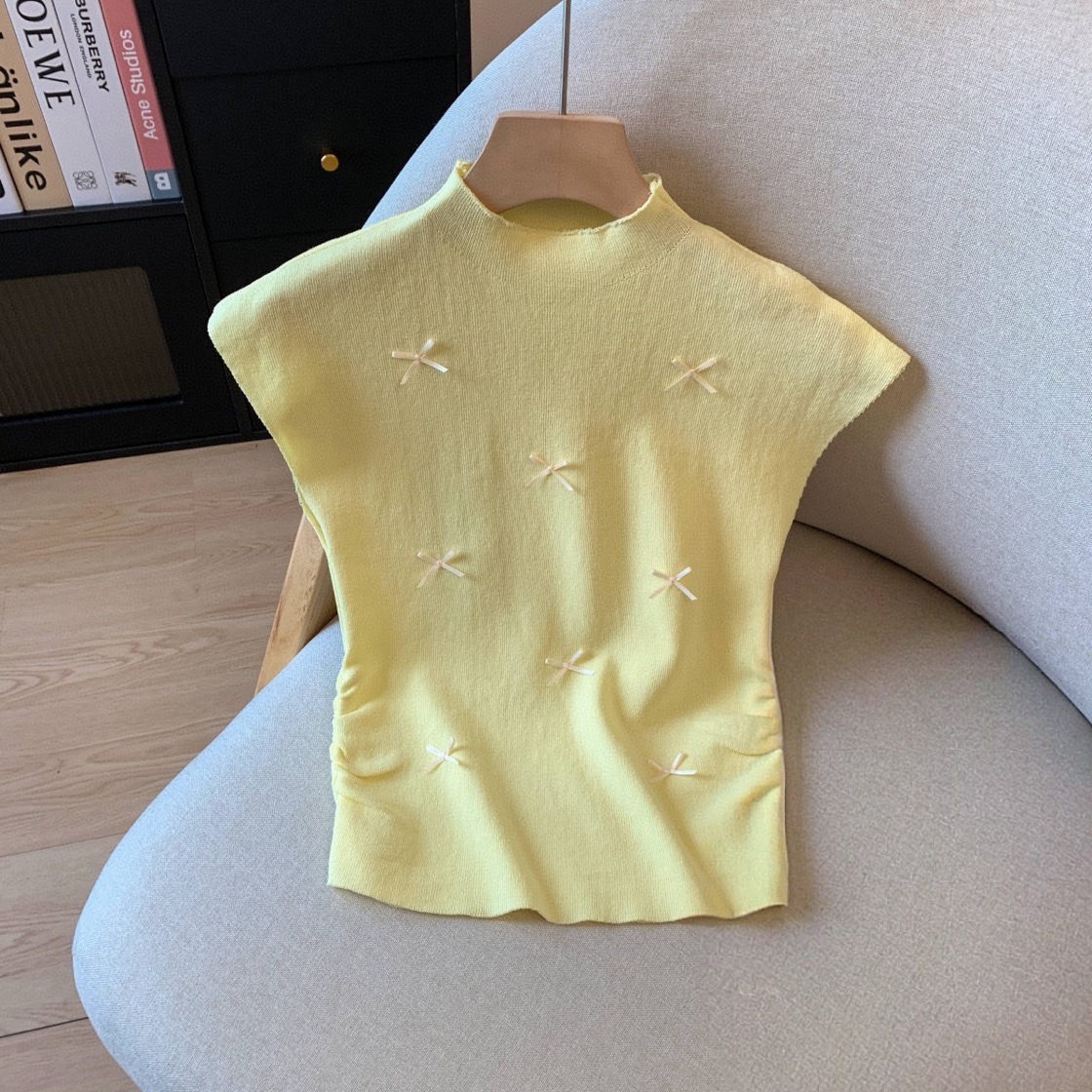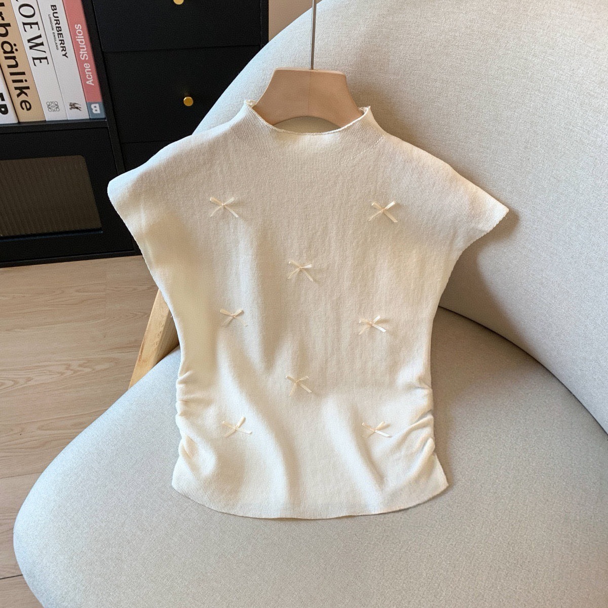韩系气质甜美软糯蝴蝶结 新款半高领修身显瘦 减龄针织无袖上衣女