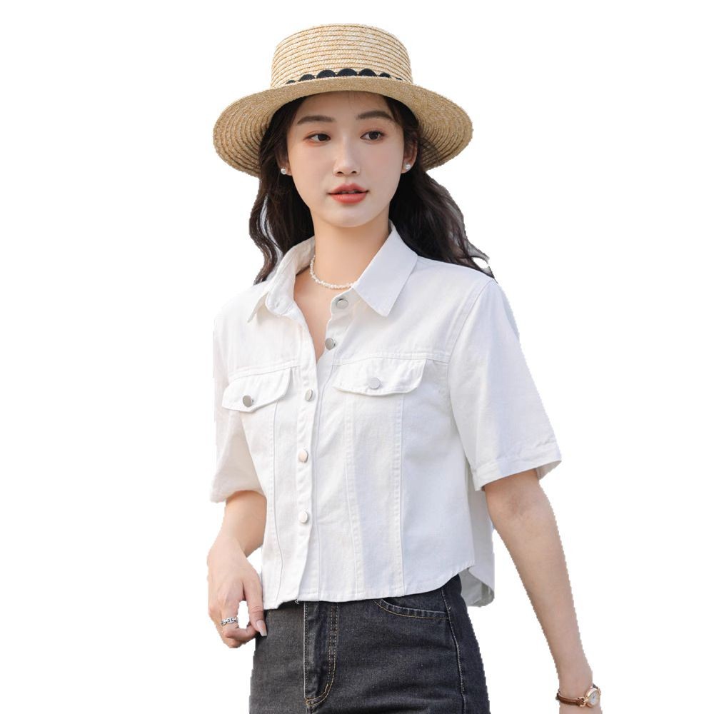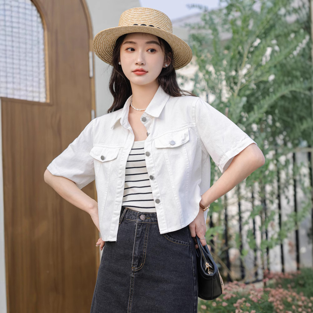 爱依轩 白色牛仔短袖衬衫外套女春夏新款小个子短款夹克上衣