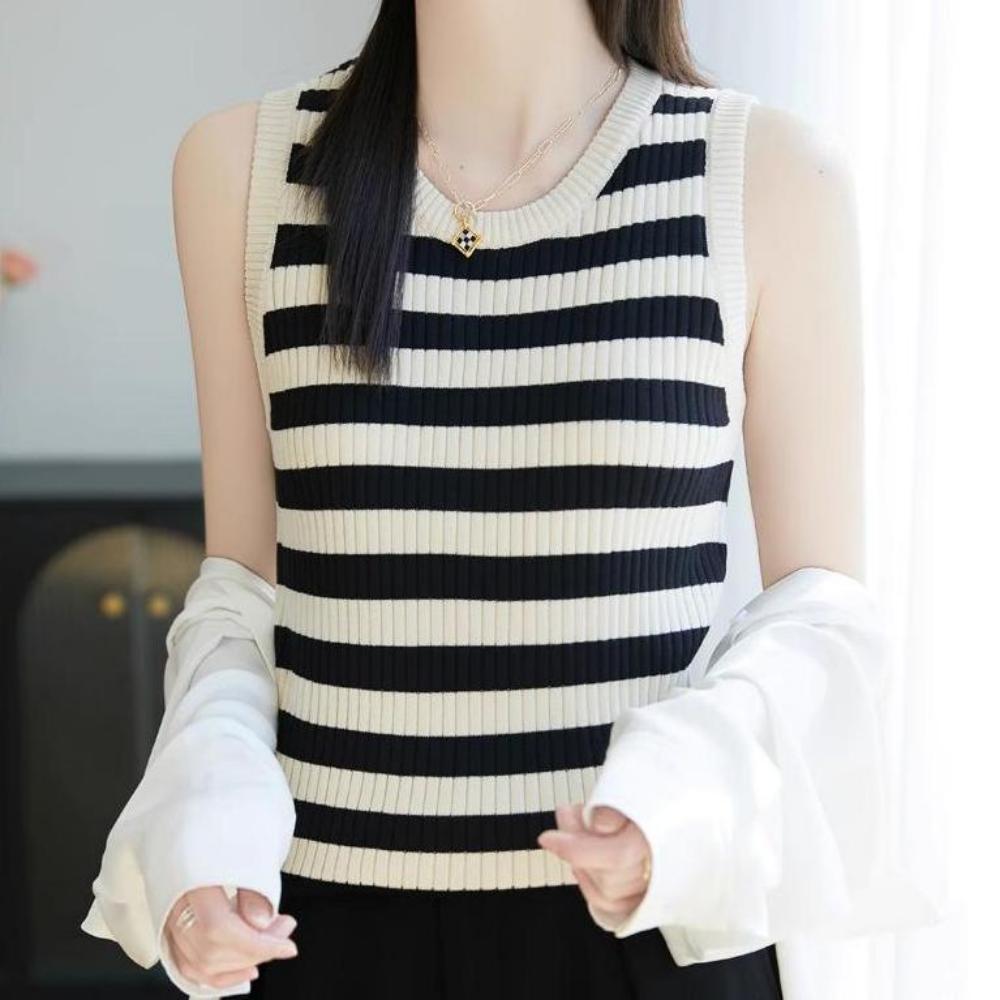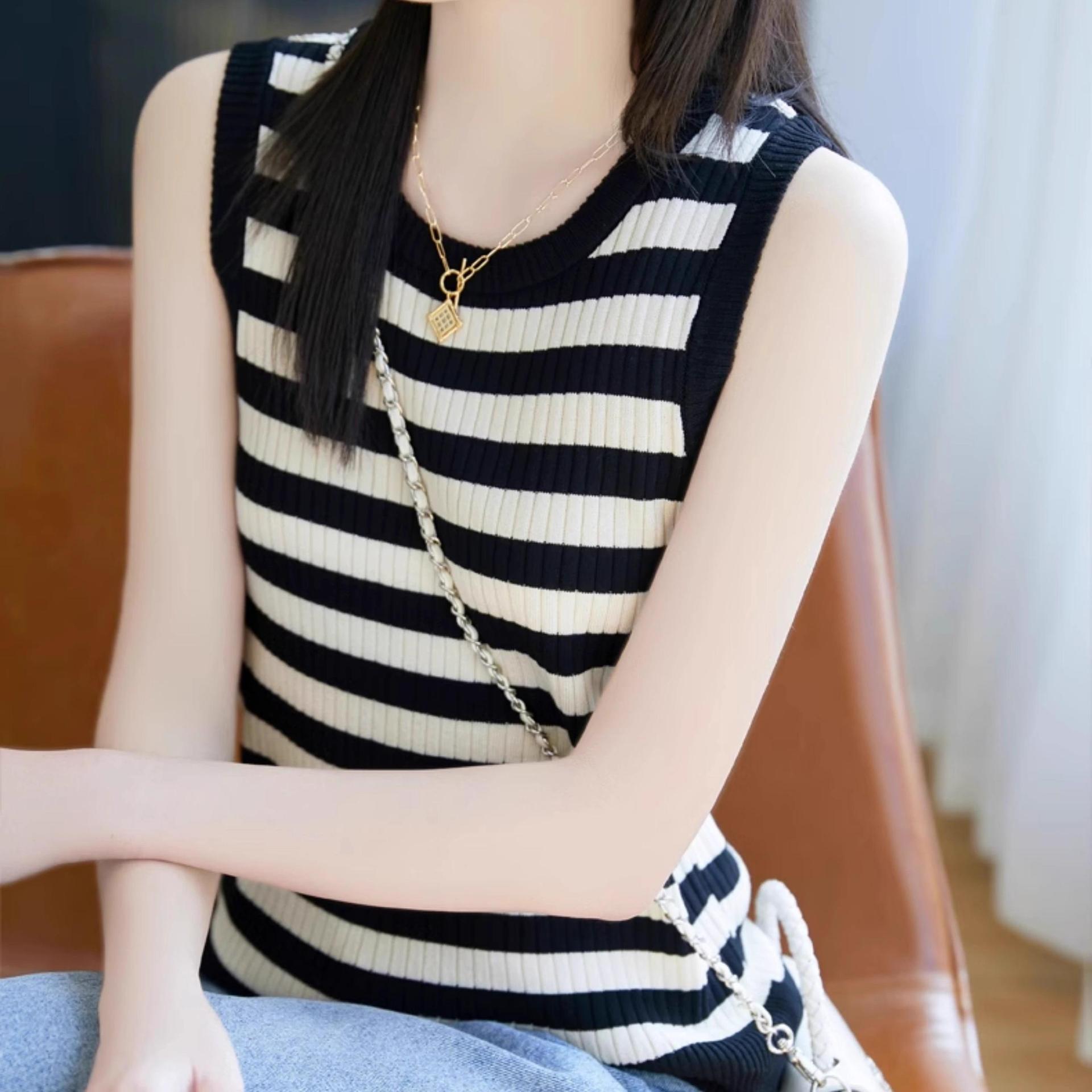 清凉条纹拼色吊带背心女圆领夏薄外穿冰丝无袖时尚西装内搭打底衫