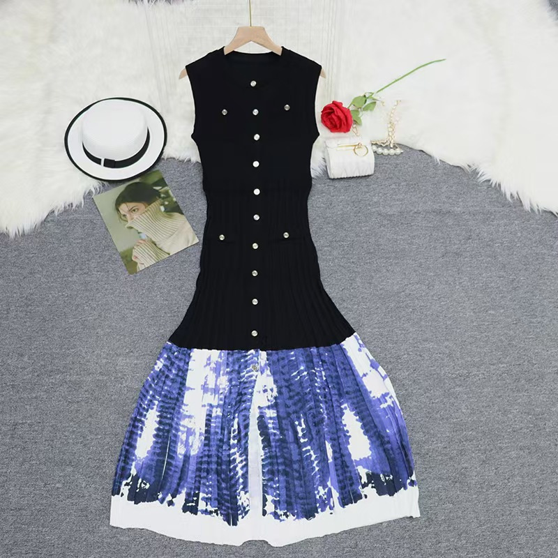跨境欧美2025夏季新款法式连衣裙拼色单排扣无袖圆领百褶针织长裙