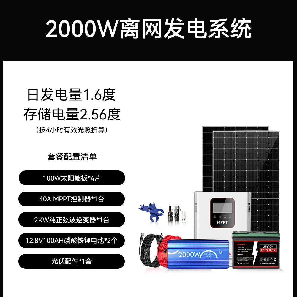 A级太阳能板+40AMPPT控制器+2000W纯正弦波逆变器+A级磷酸铁锂电池