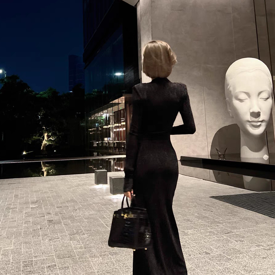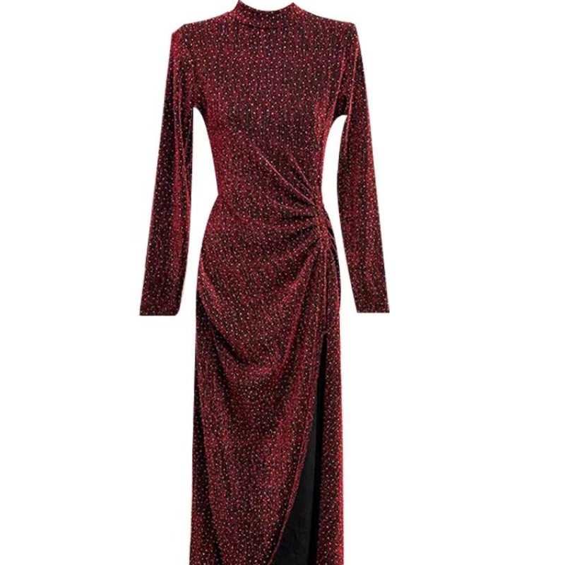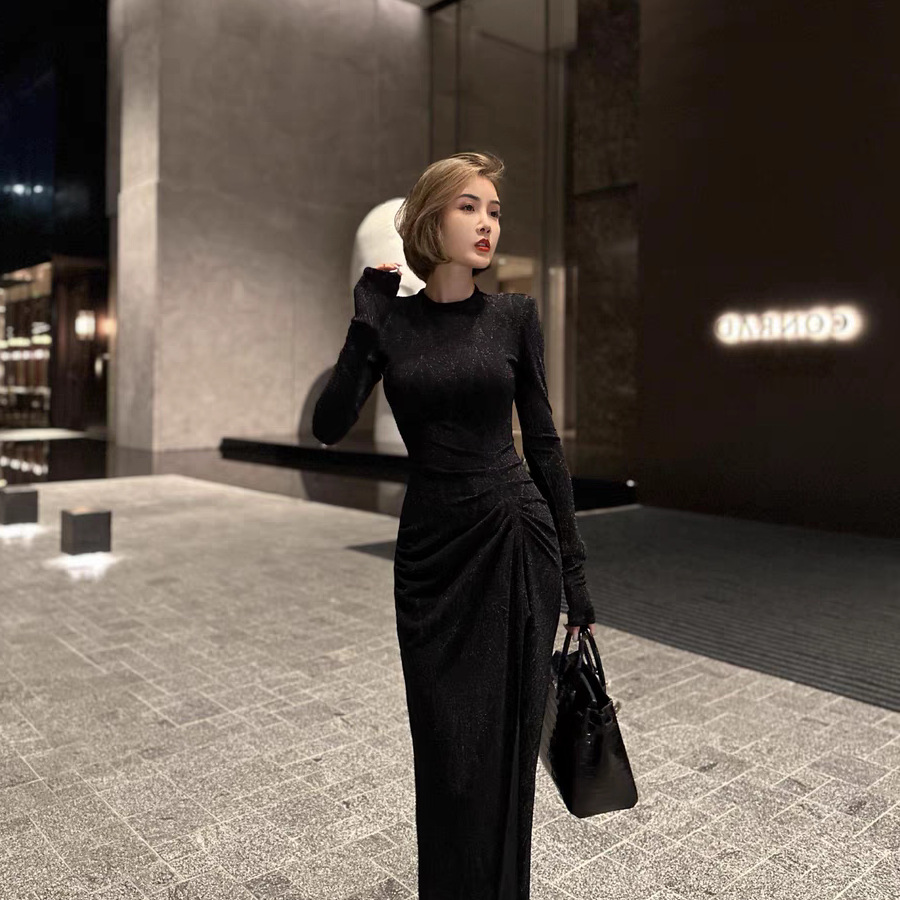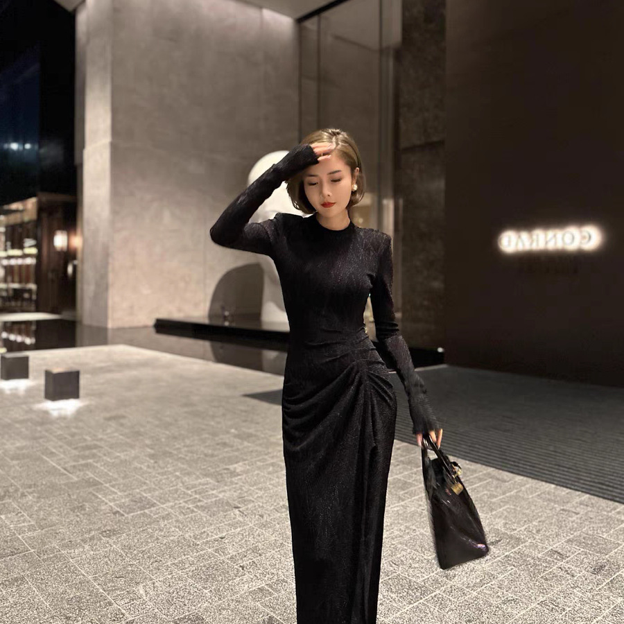 奢感光泽银葱羊毛派对礼服褶皱收腰摩登新贵连衣裙女装开叉连衣裙