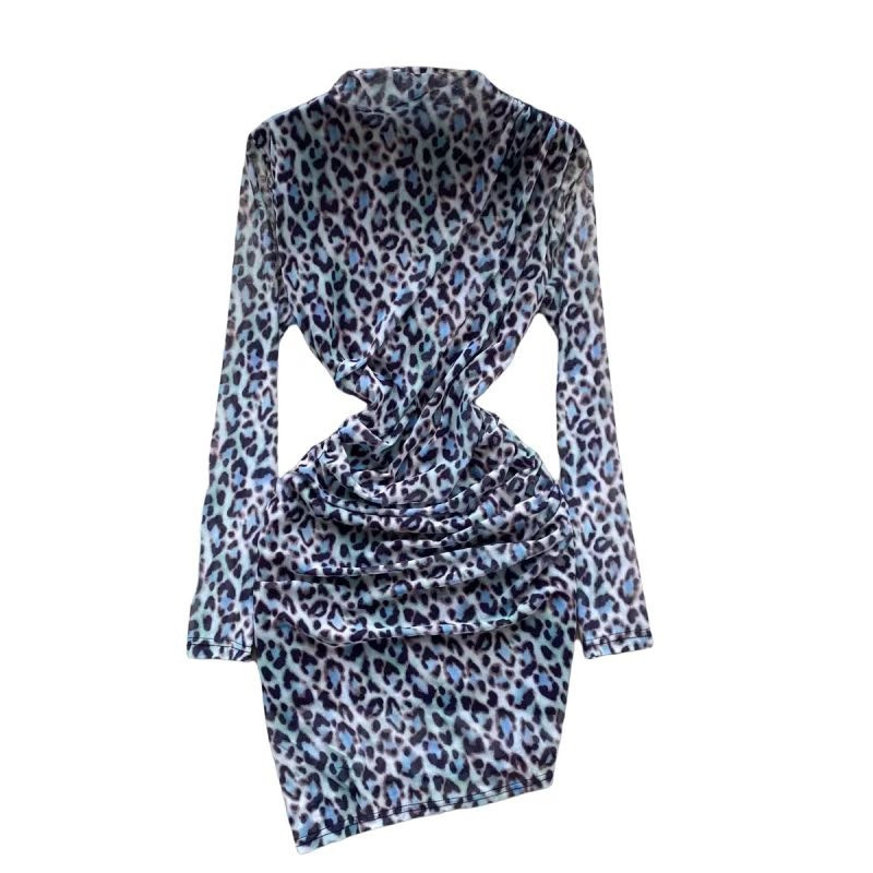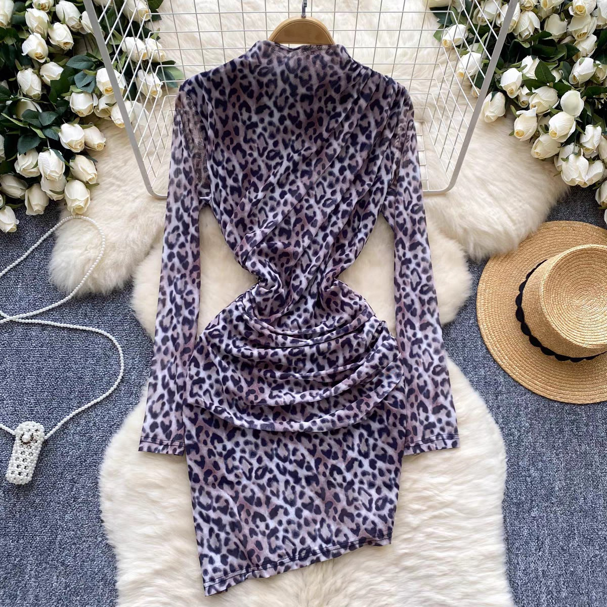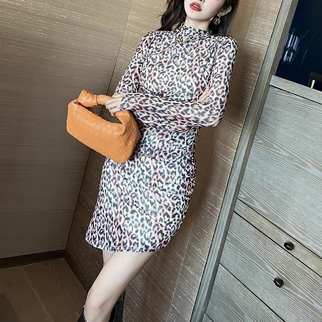 半高领辣妹豹纹网纱连衣裙修身长袖2025性感新款短裙时尚春秋季