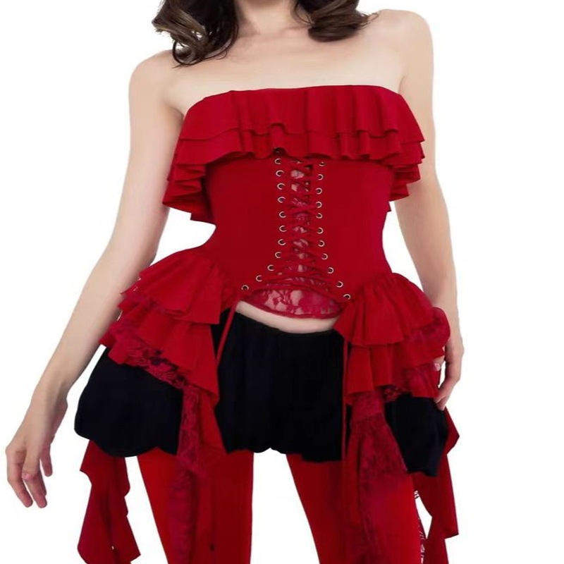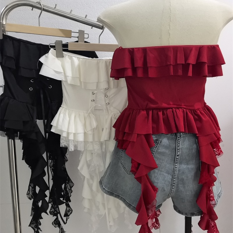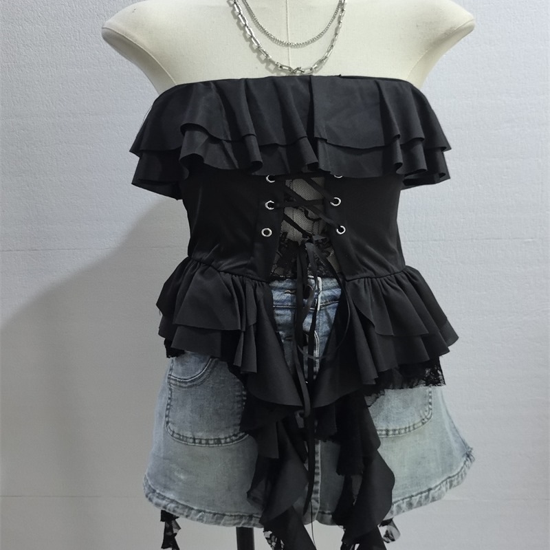 2024甜酷辣妹ins蕾丝拼接抽绳绑带不规则飘带抹胸女性感修身上衣