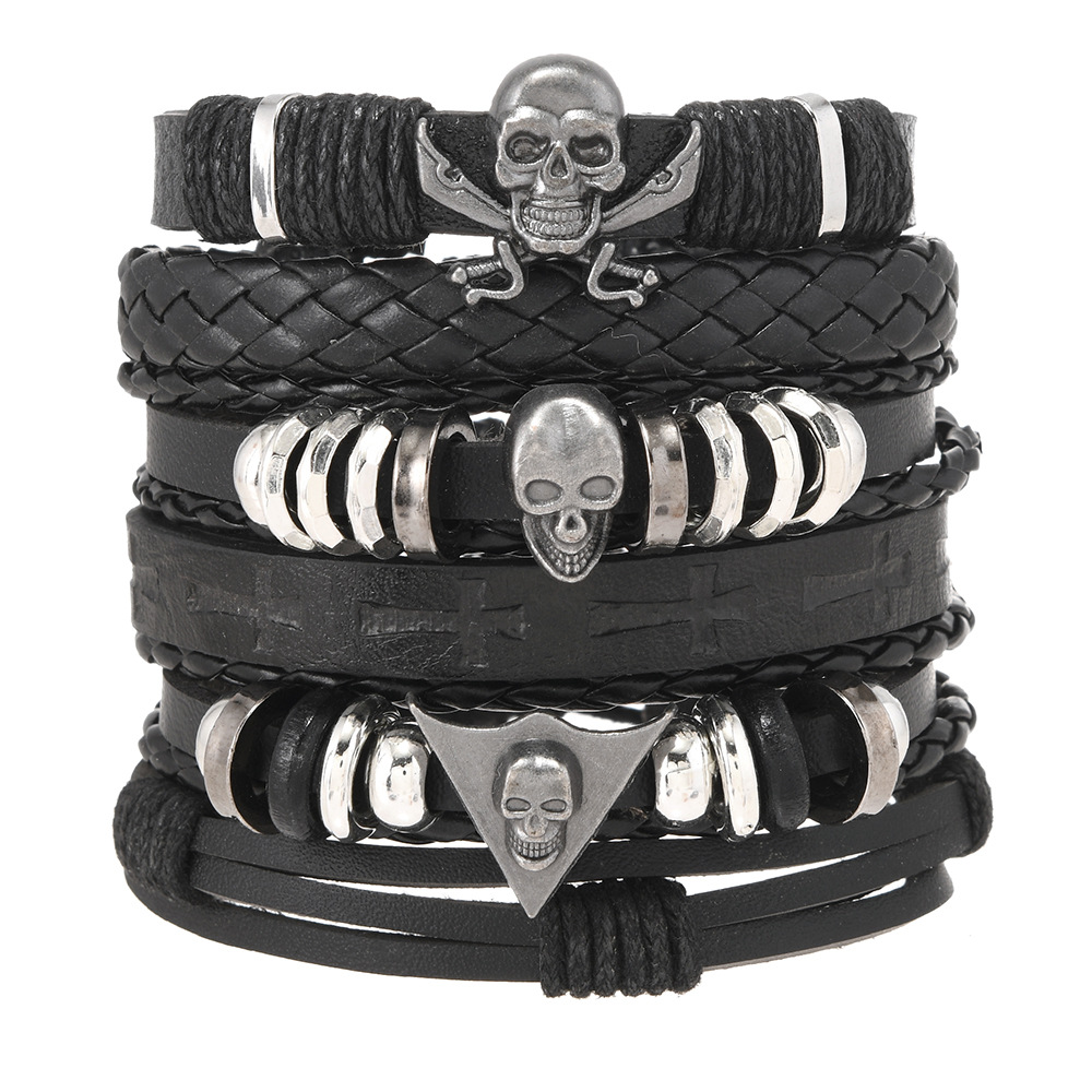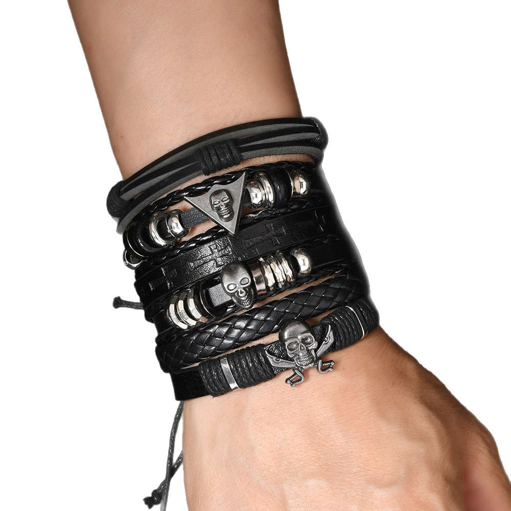哥特式多层编织骷髅头手链套装 新款男士黑色五角星皮革手环